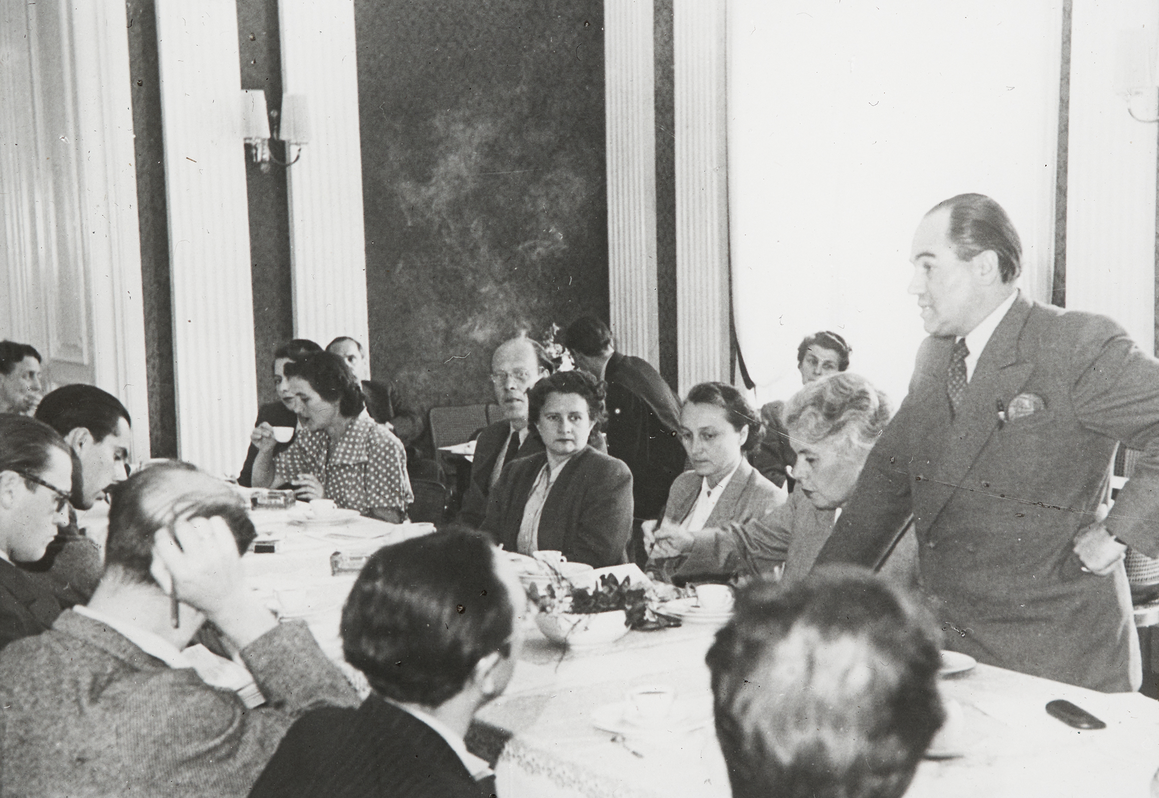 Mehrere Personen, darunter Marianne Pollak, an einem langen Konferenztisch, auf dem sich Essen und Kaffee befindet.