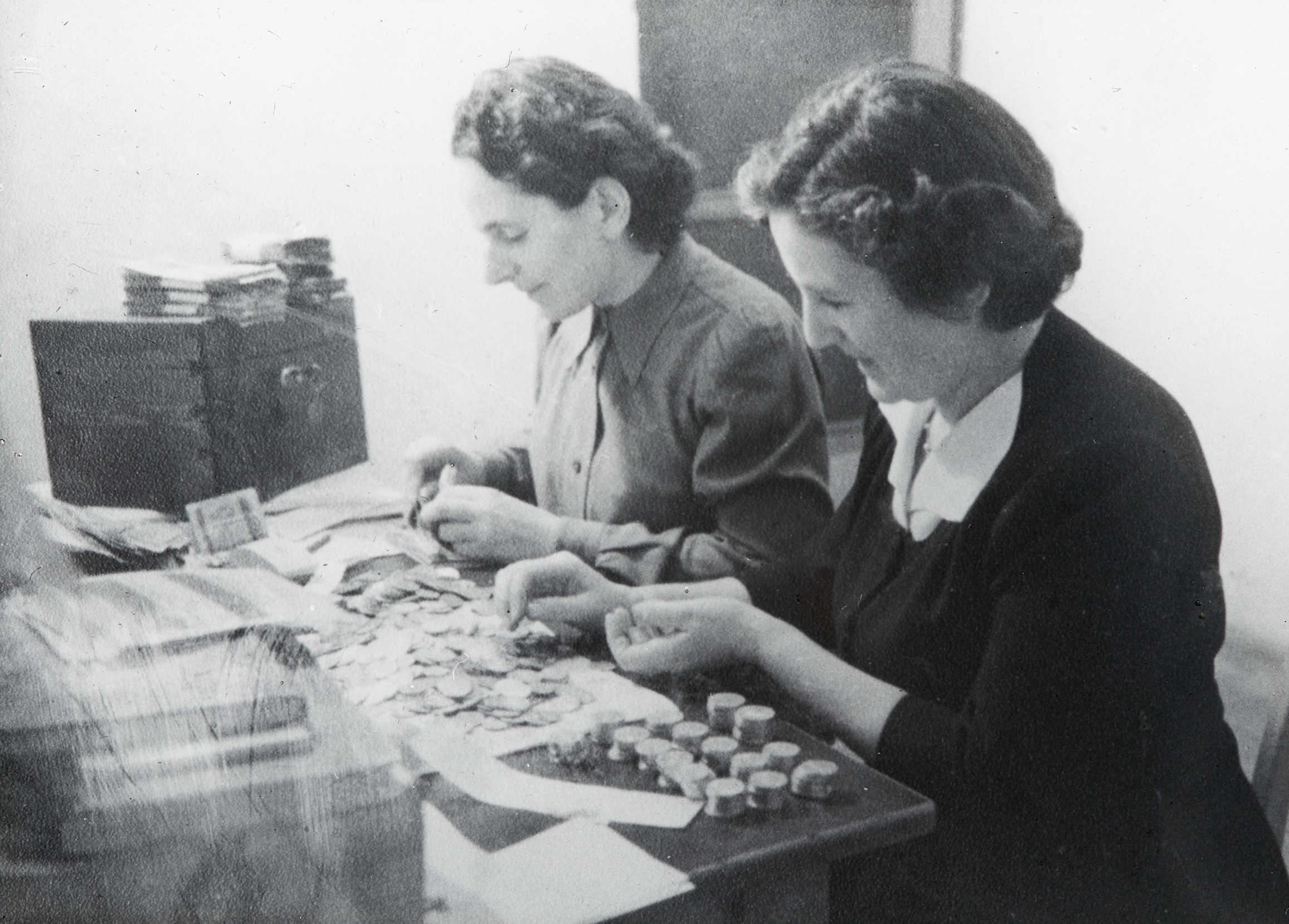 Hinter einer Glasscheibe sortieren zwei Frauen Münzgeld.