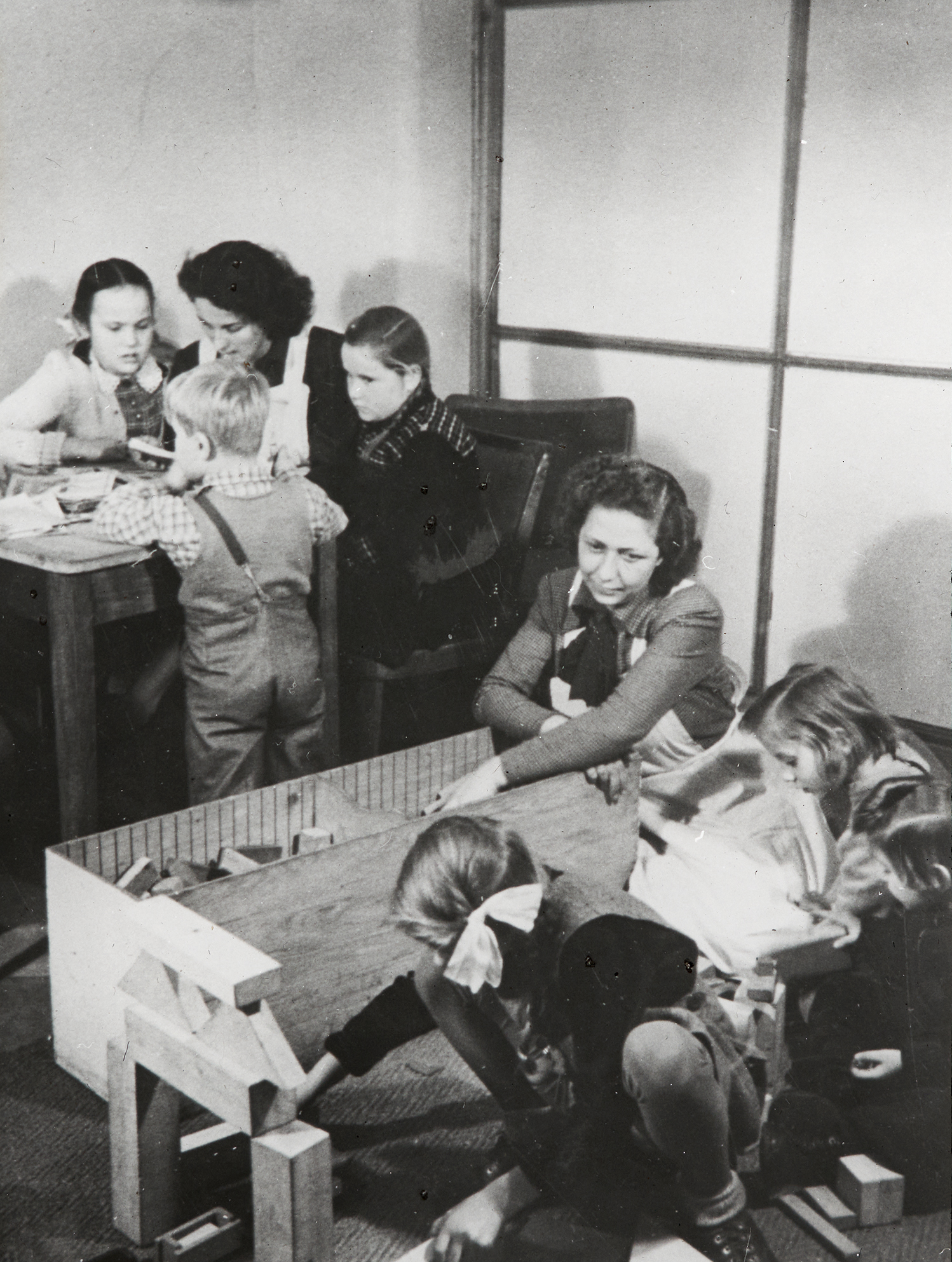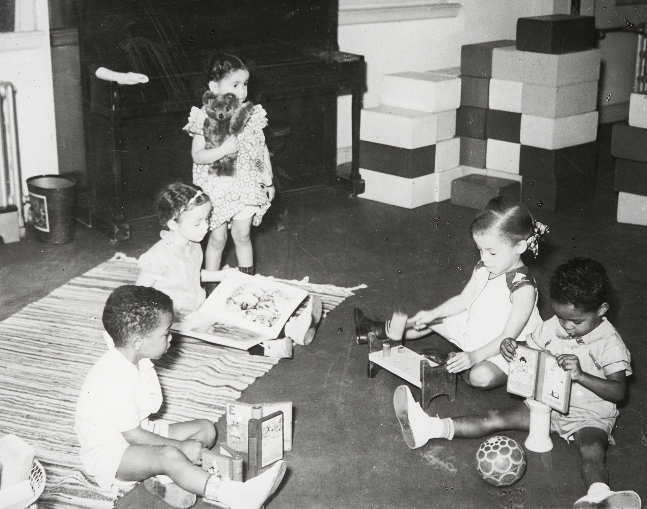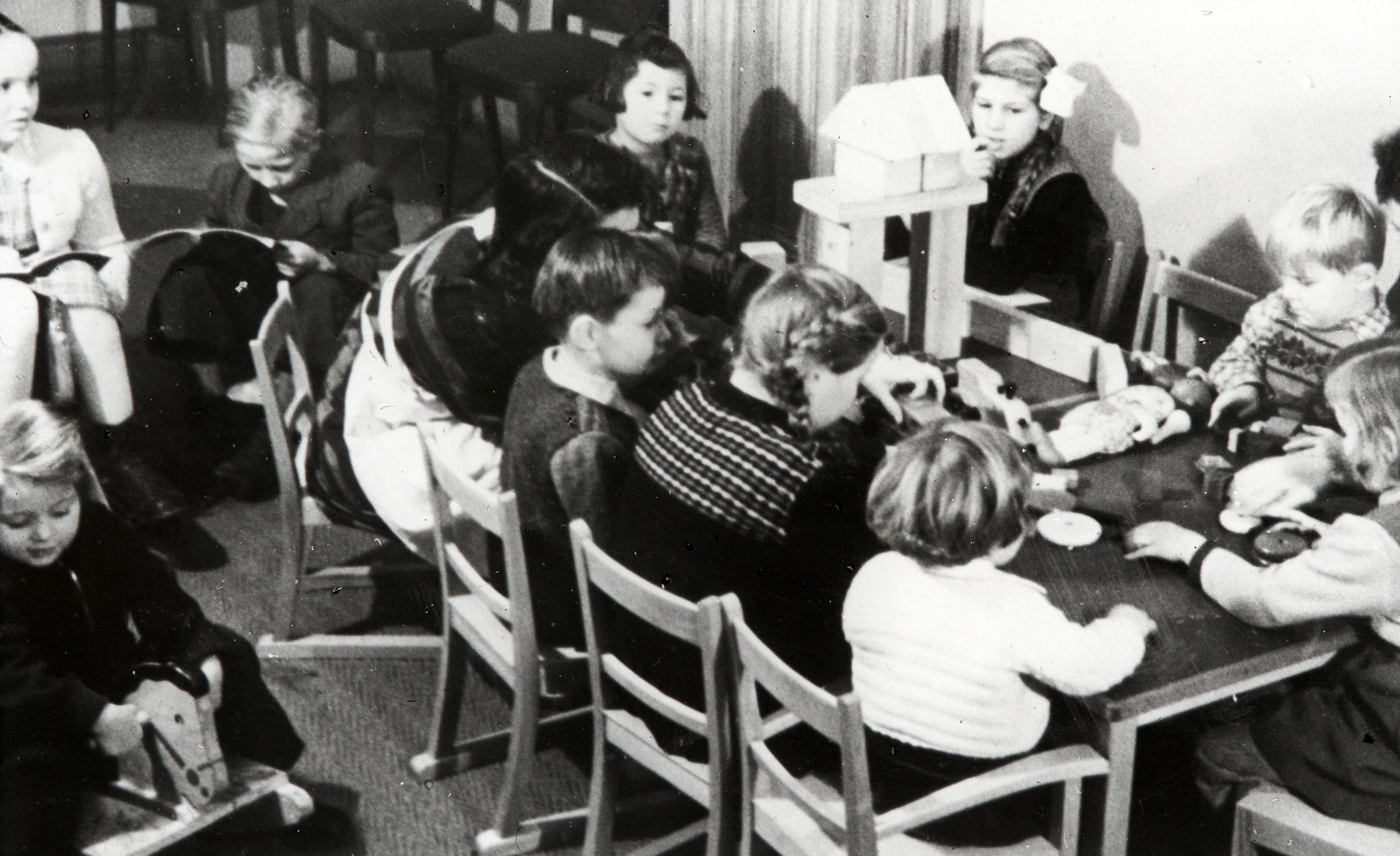 Kinder, die unterschiedliche Aktivitäten machen. Ein paar Kinder im Hintergrund lesen, ein Kind links spielt auf einem Schaukelpferd. Die restlichen Kinder sitzen am Tisch.