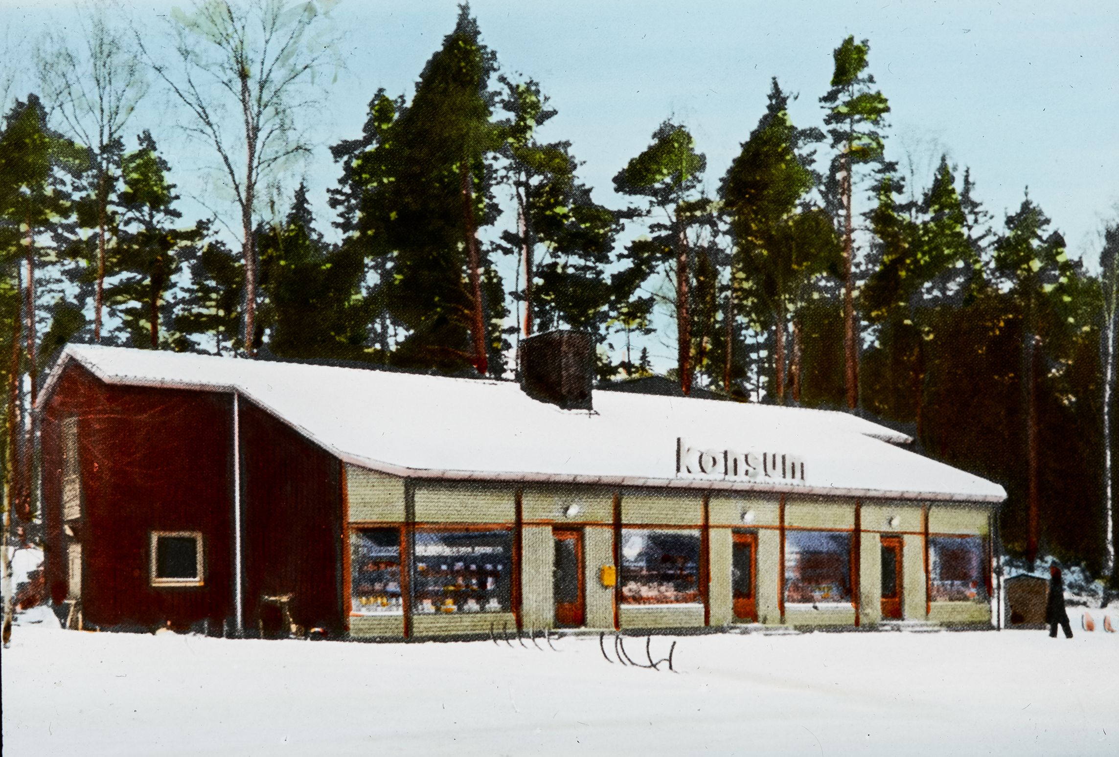 Winterlandschaft mit einer Filliale von Konsum, einer Supermarkt-Kette.
