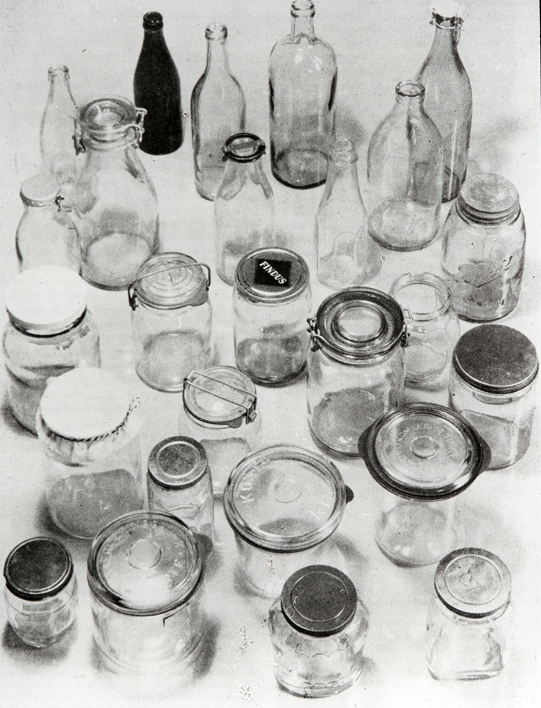 Foto von Marmeladengläsern und leeren Glasflaschen. Diese werden entweder zur gemäßen Entsorgung oder zur weiteren Aufbewahrung und Konservierung für Lebensmittel und Getränke aufgehoben.