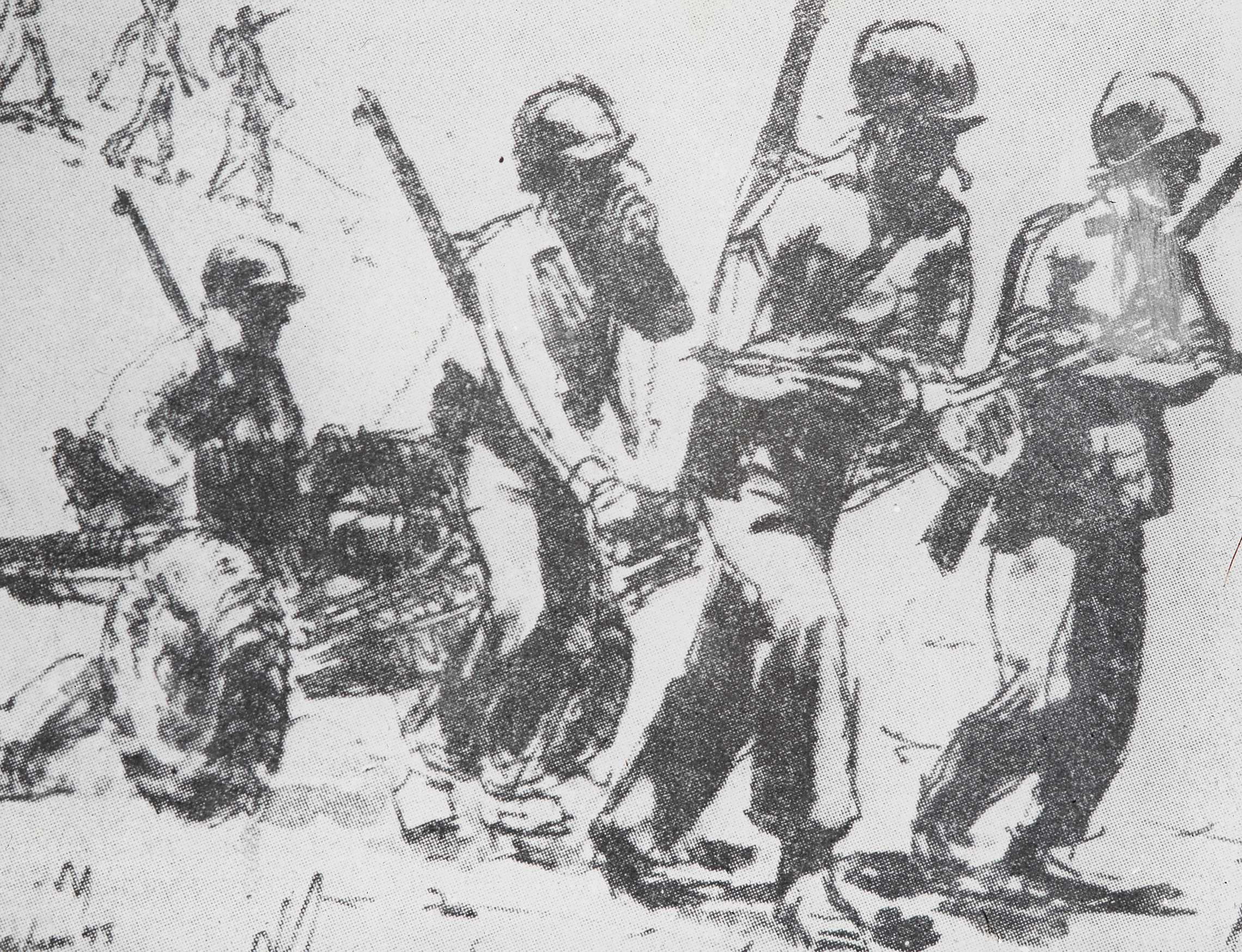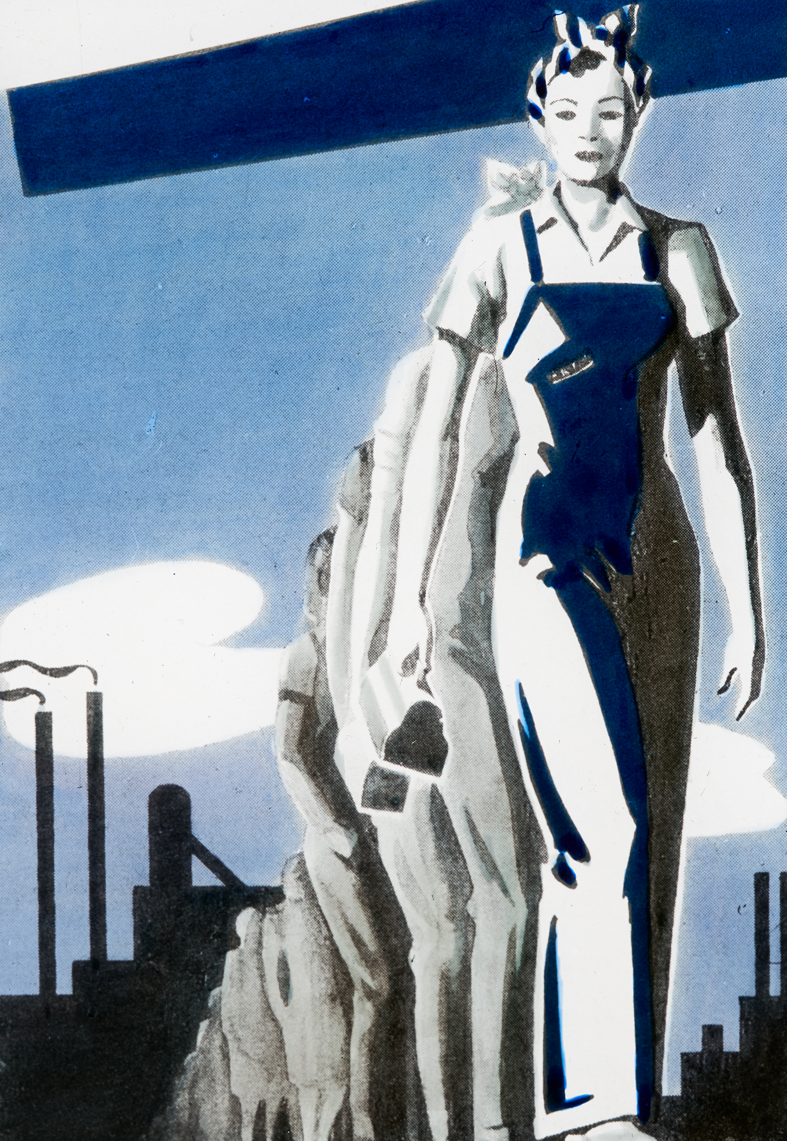 Eine Arbeiterin, in deren Schatten weitere Personen gehen. Weiter hinten ist eine Fabrik zu erkennen.
