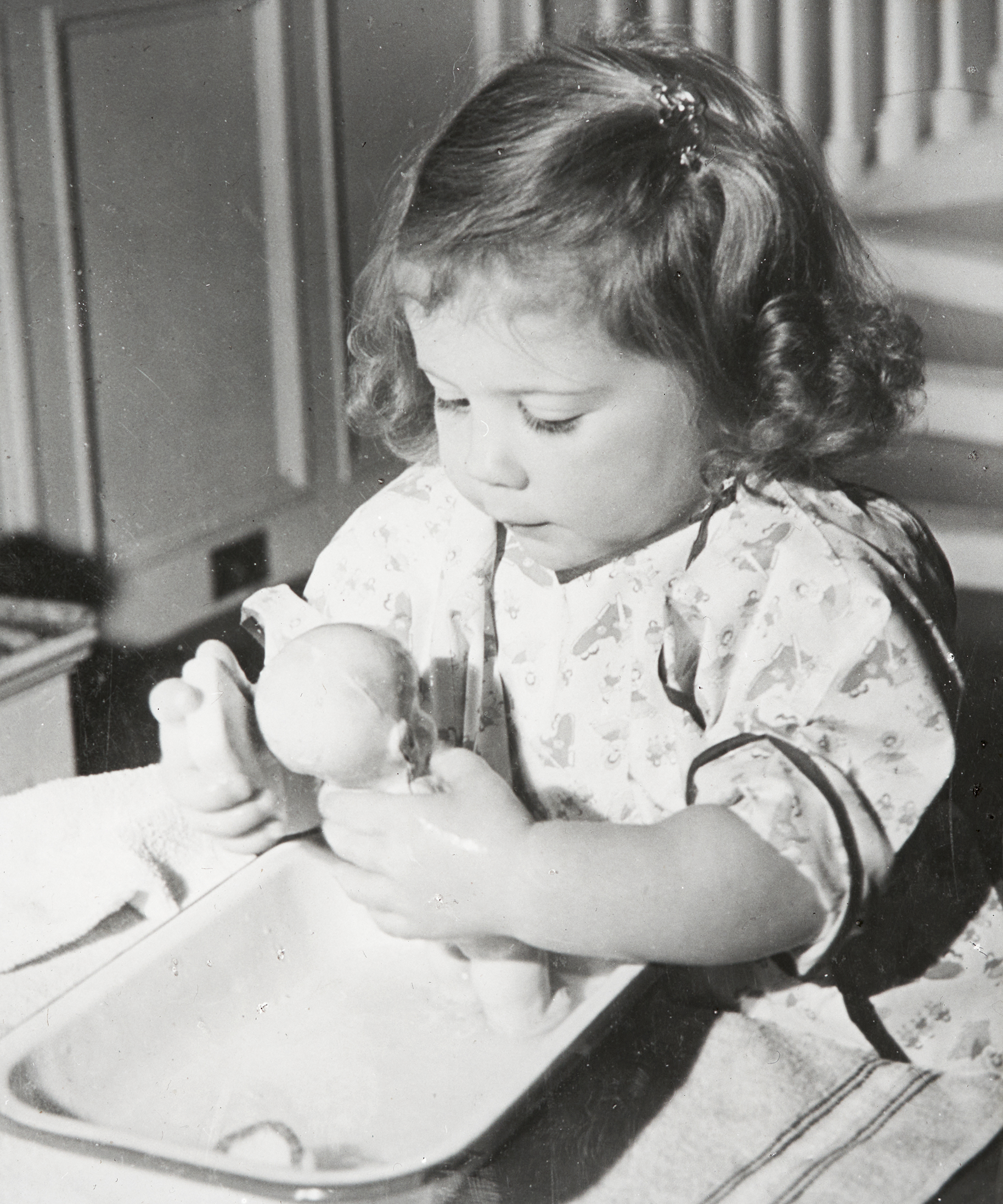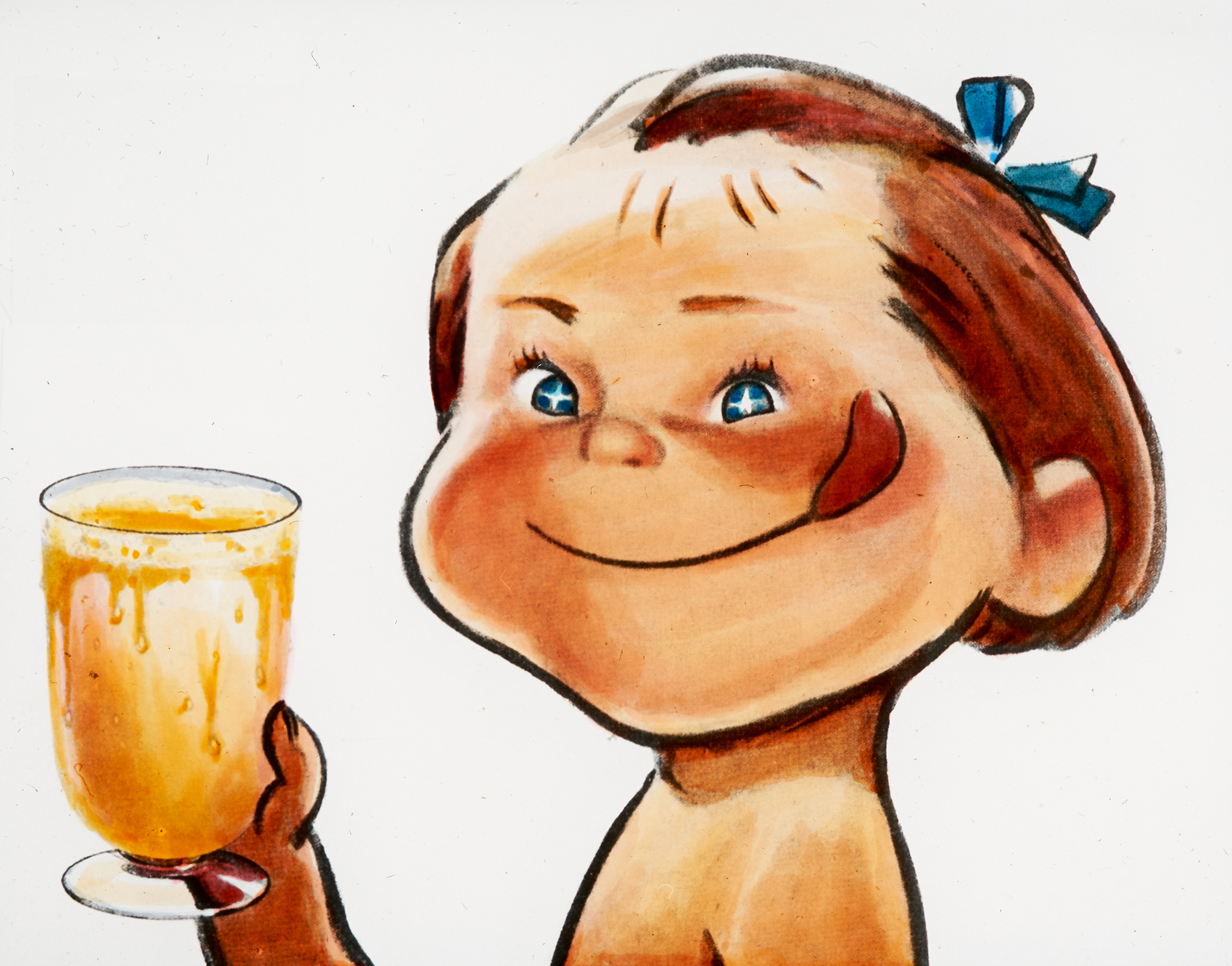 Karikatur eines kleinen Mädchens, das ein Getränk hält.