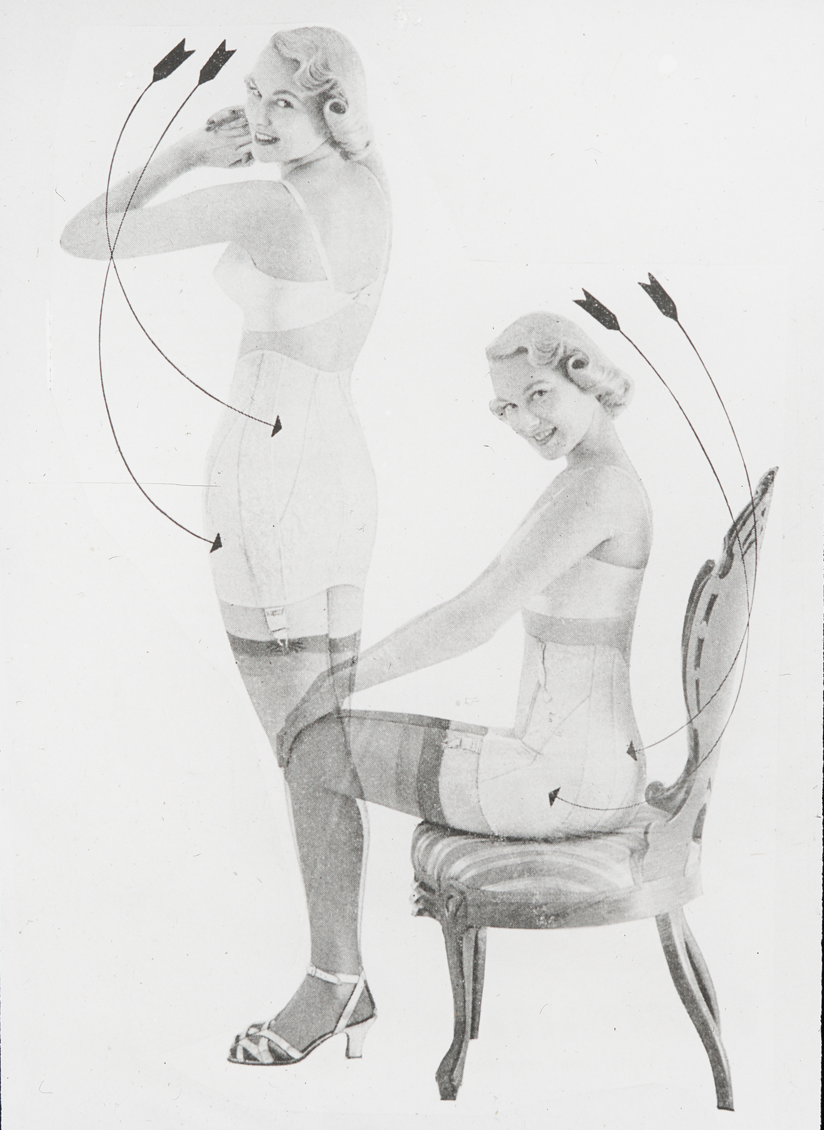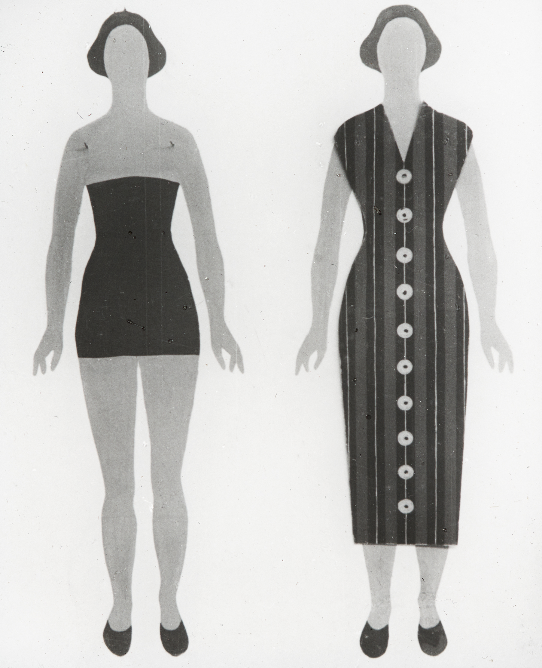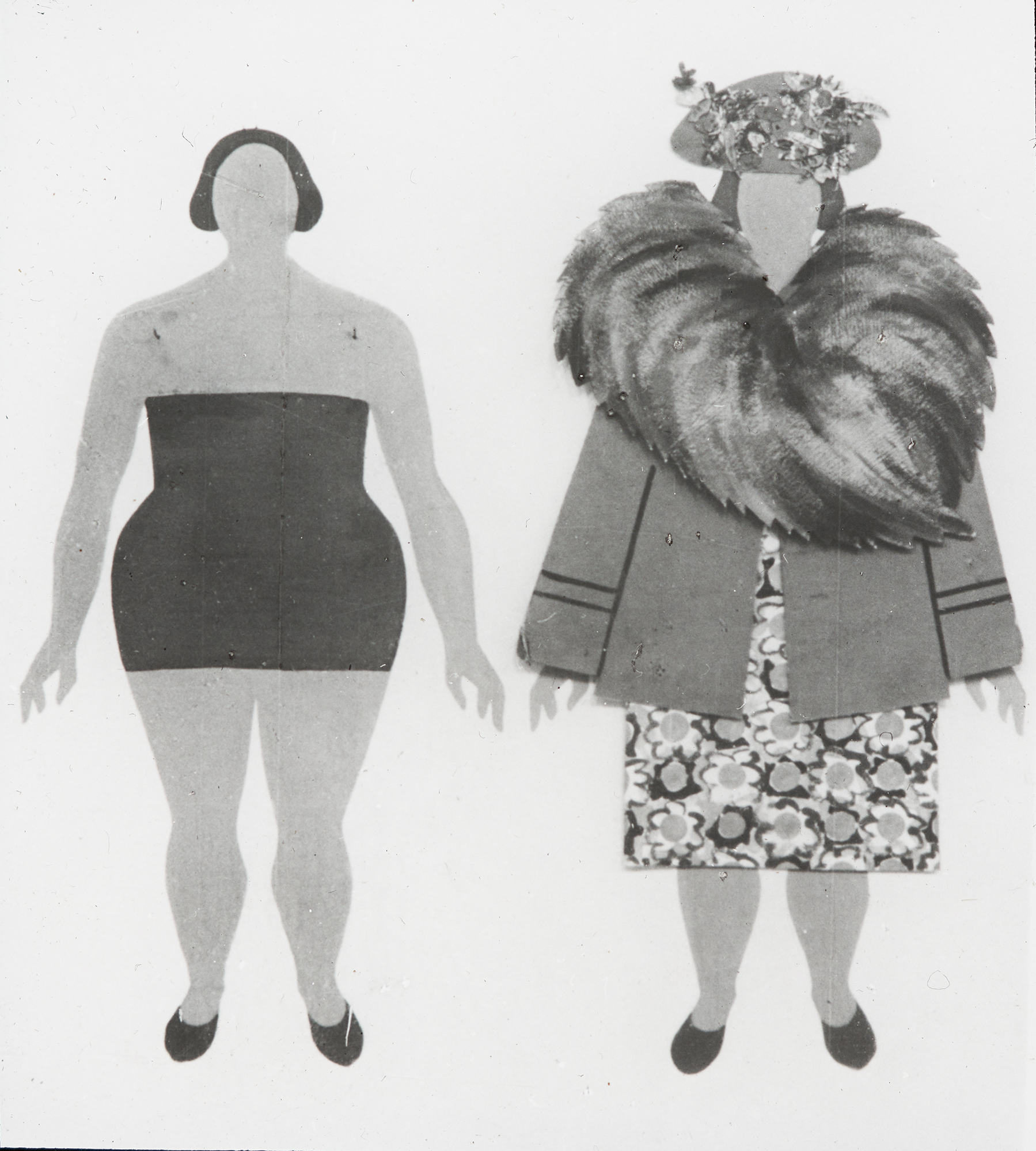 Zwei Frauenkörper, gedruckt auf Papier, bekleidet mit auf Papier gedruckte Kleidungsstücke, die aufgeklebt wurden.