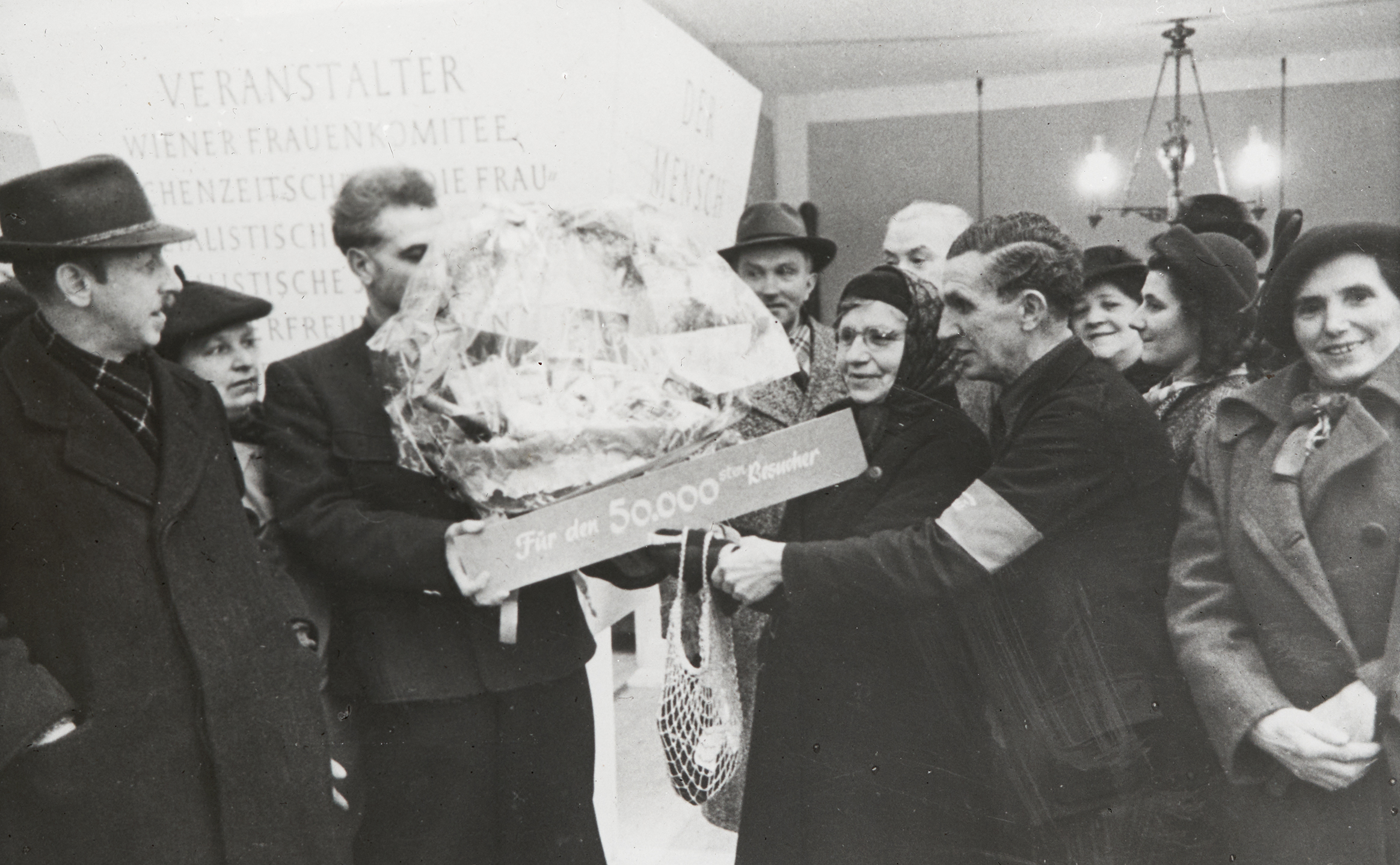 Zum Jubiläum des 50 000. Besuchers der Ausstellung "Die Frau und ihre Wohnung" wird diesem Mann ein Preis überreicht.