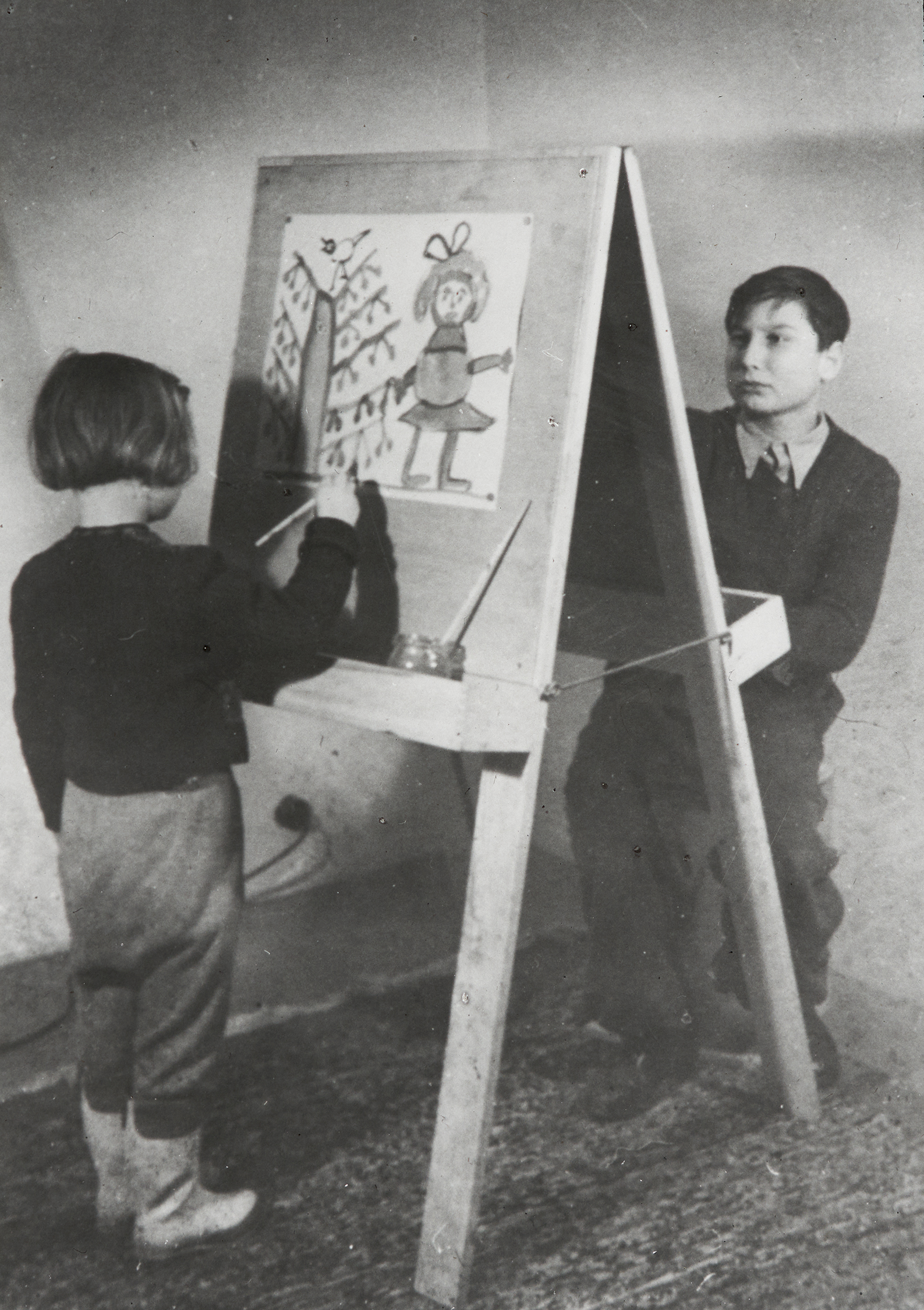 Zwei Kinder, die auf einer doppelseitigen Staffelei malen.