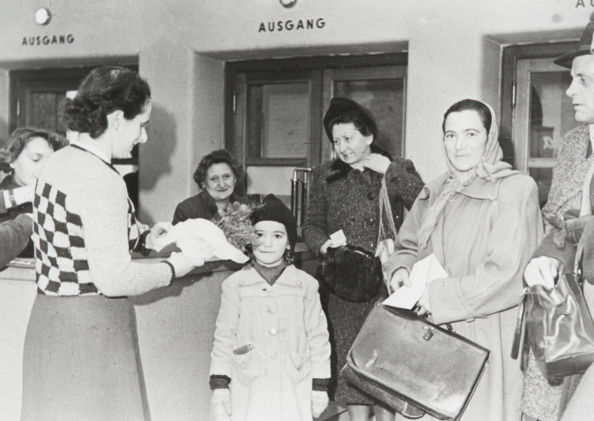 Eine Frau überreicht einer anderen Frau einen Strauß Blumen, im Hintergrund ist der Ausgang des Messepalasts zu sehen.