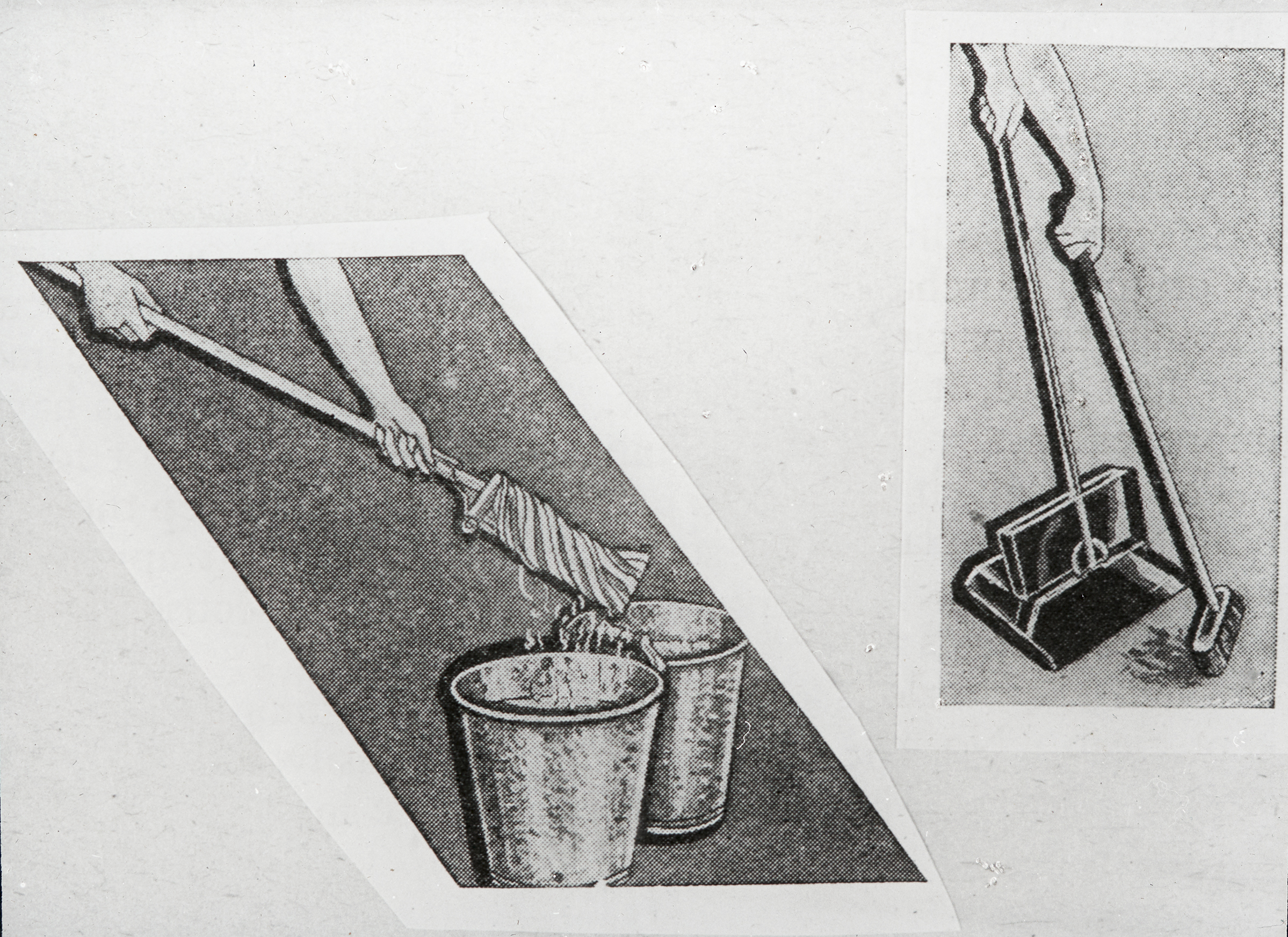 Zwei Bilder von Putzutensilien: auf einem der Bilder ist ein Wischmopp, auf dem anderen ist ein Besen zu erkennen.