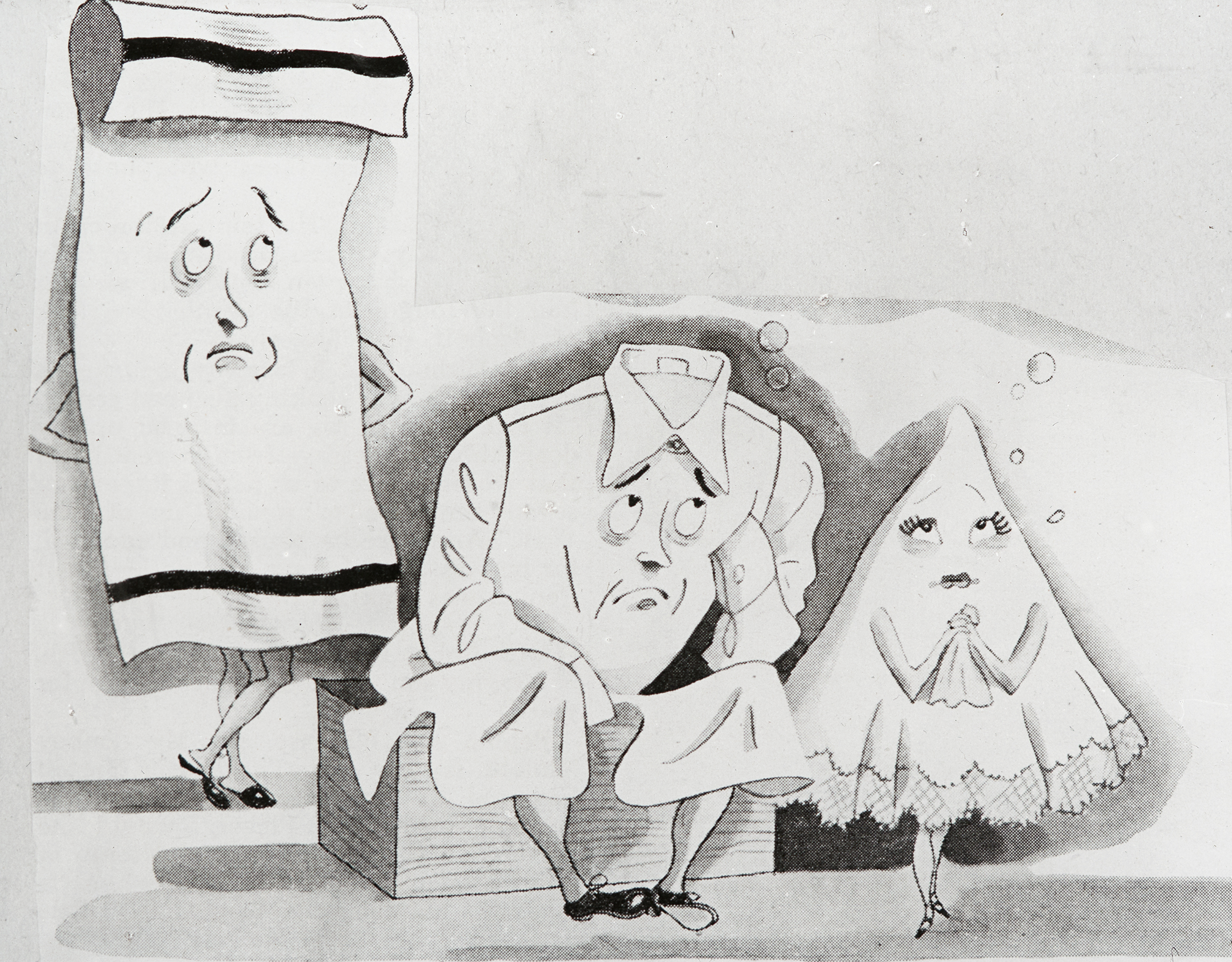 Verschiedene Teile aus Stoff, ein Handtuch, ein Hemd und ein Tuch. Auf jedem dieser Stücke erkennt man ein nachdenkliches Gesicht.