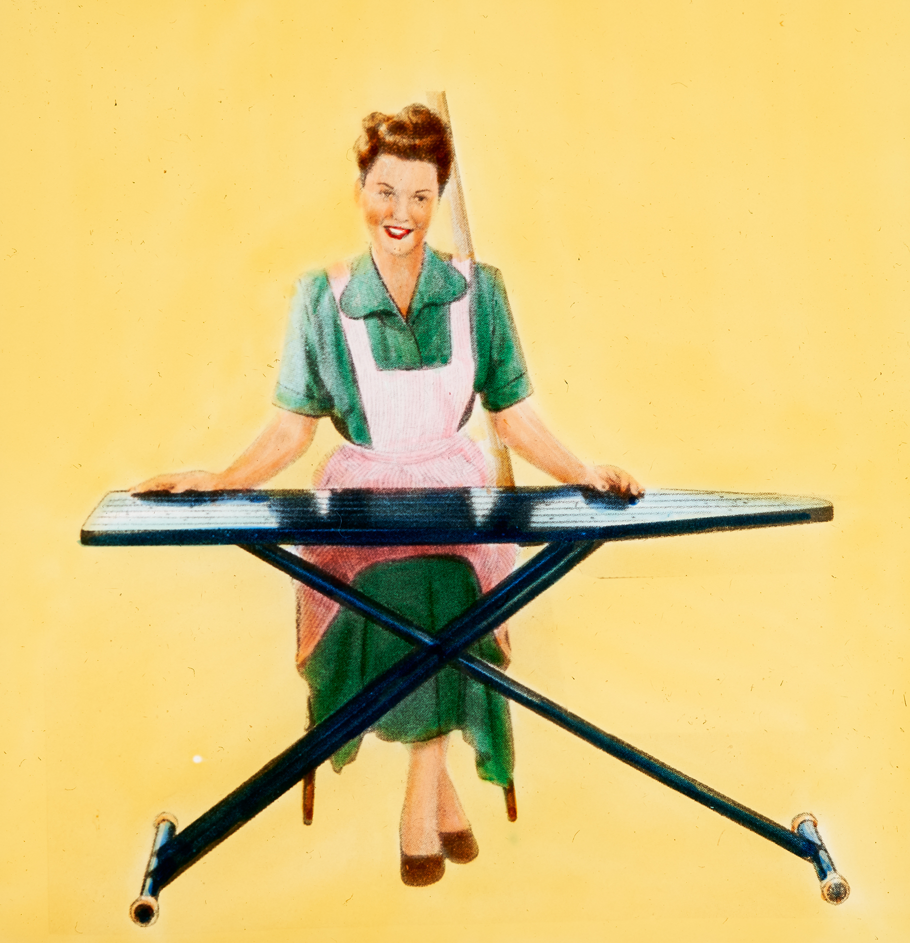 Eine Frau, die vor sich ein Bügelbrett stehen hat.