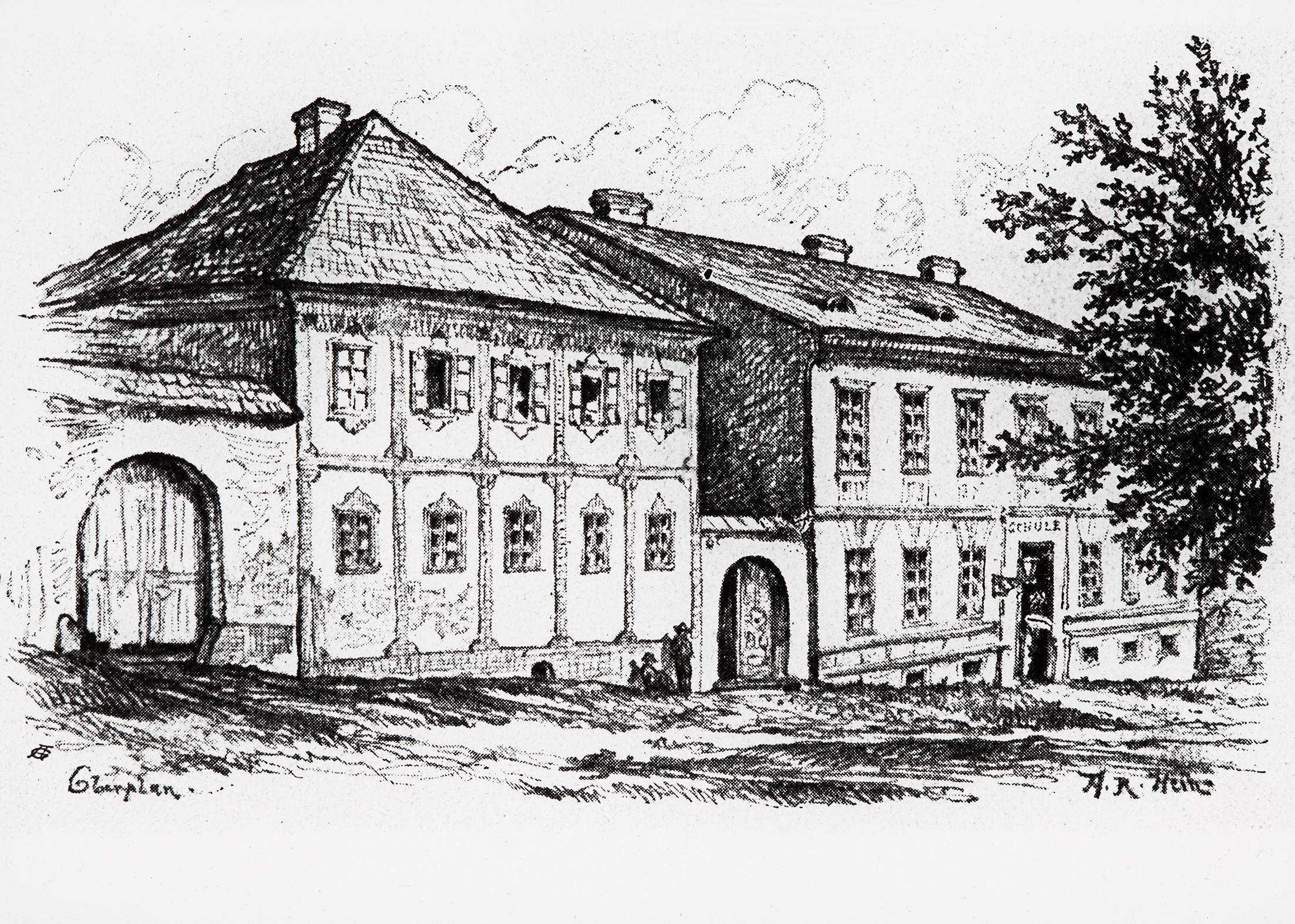 Ein typisches altes Gebäude, das die Aufschrift "Schule" trägt. Unten links erkennt man die Aufschrift "Oberplan".