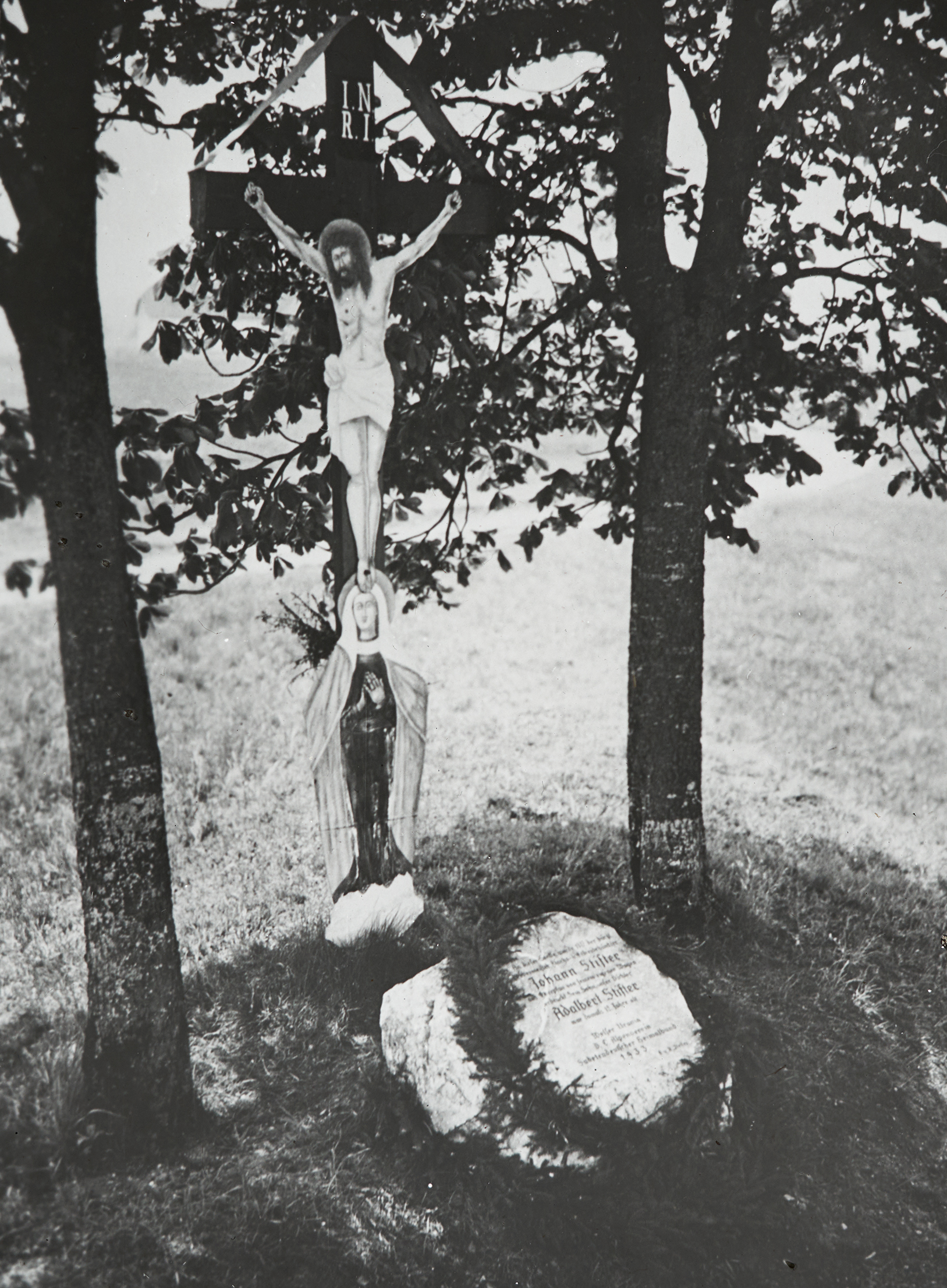 Dieses Kreuz und der darunter angebrachte Stein mit der Inschrift "An dieser Stelle wurde 1817 der bürgl. Webermeister, Flachs- und Getreidehändler Johann Stifter aus Oberplan von seinem eigenen Wagen erdrückt.