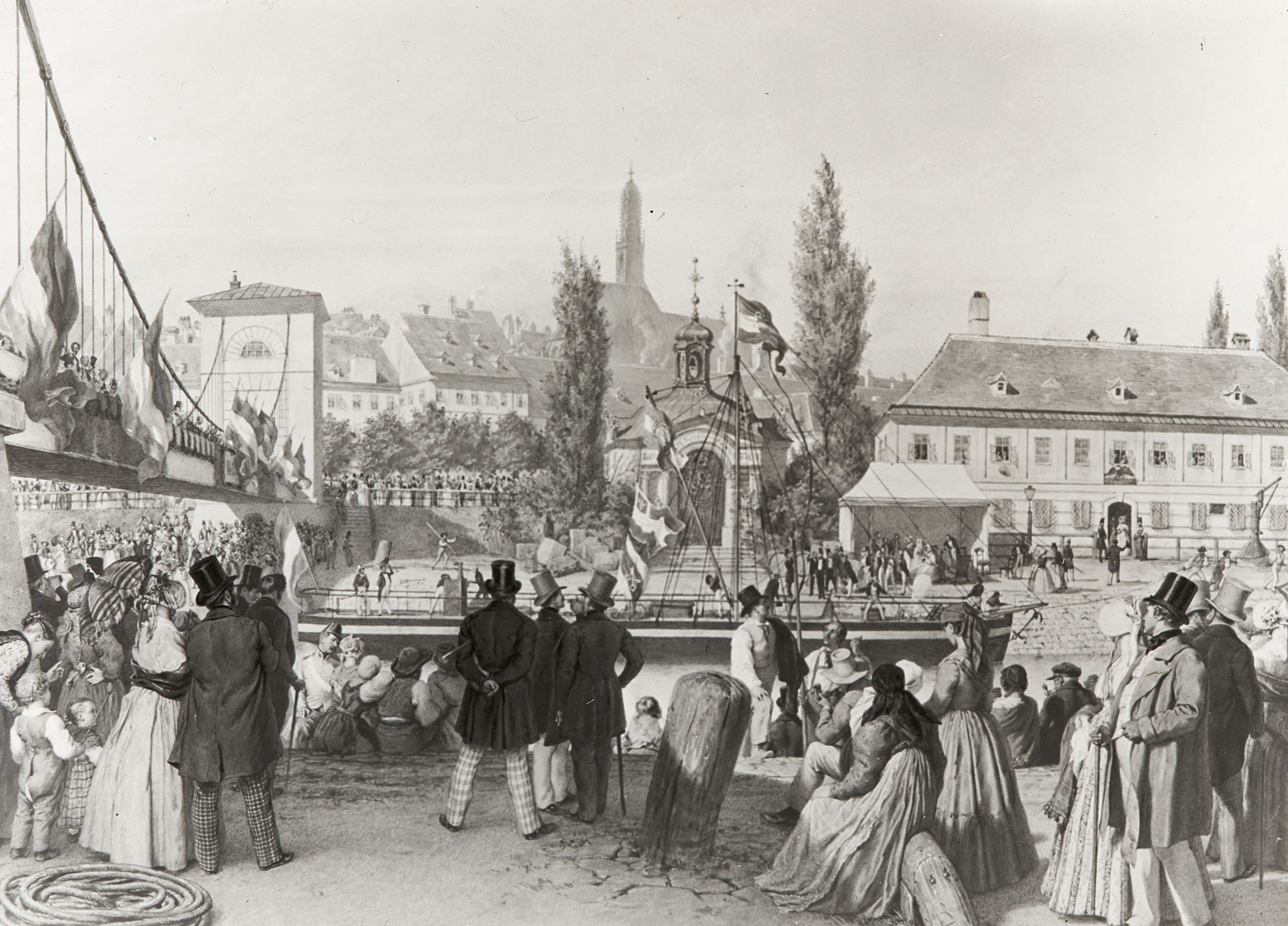 Große Menschenmengen beobachten ein Dampfschiff, das am Donaukanal in Wien anlegt.