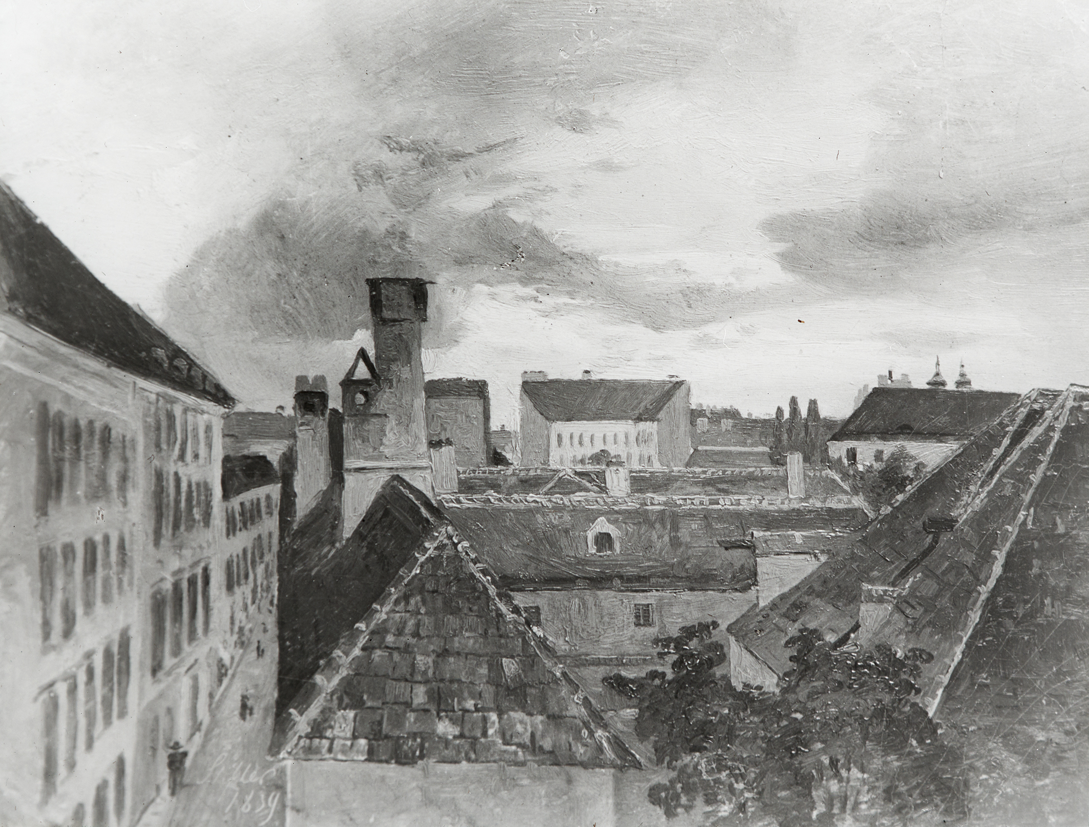 1839 malte Stifter "Blick über Wiener Vorstadthäuser und Gärten". In seiner Wohnung in der Beatrixgasse 23 vernahm er diesen Ausblick über Wien.