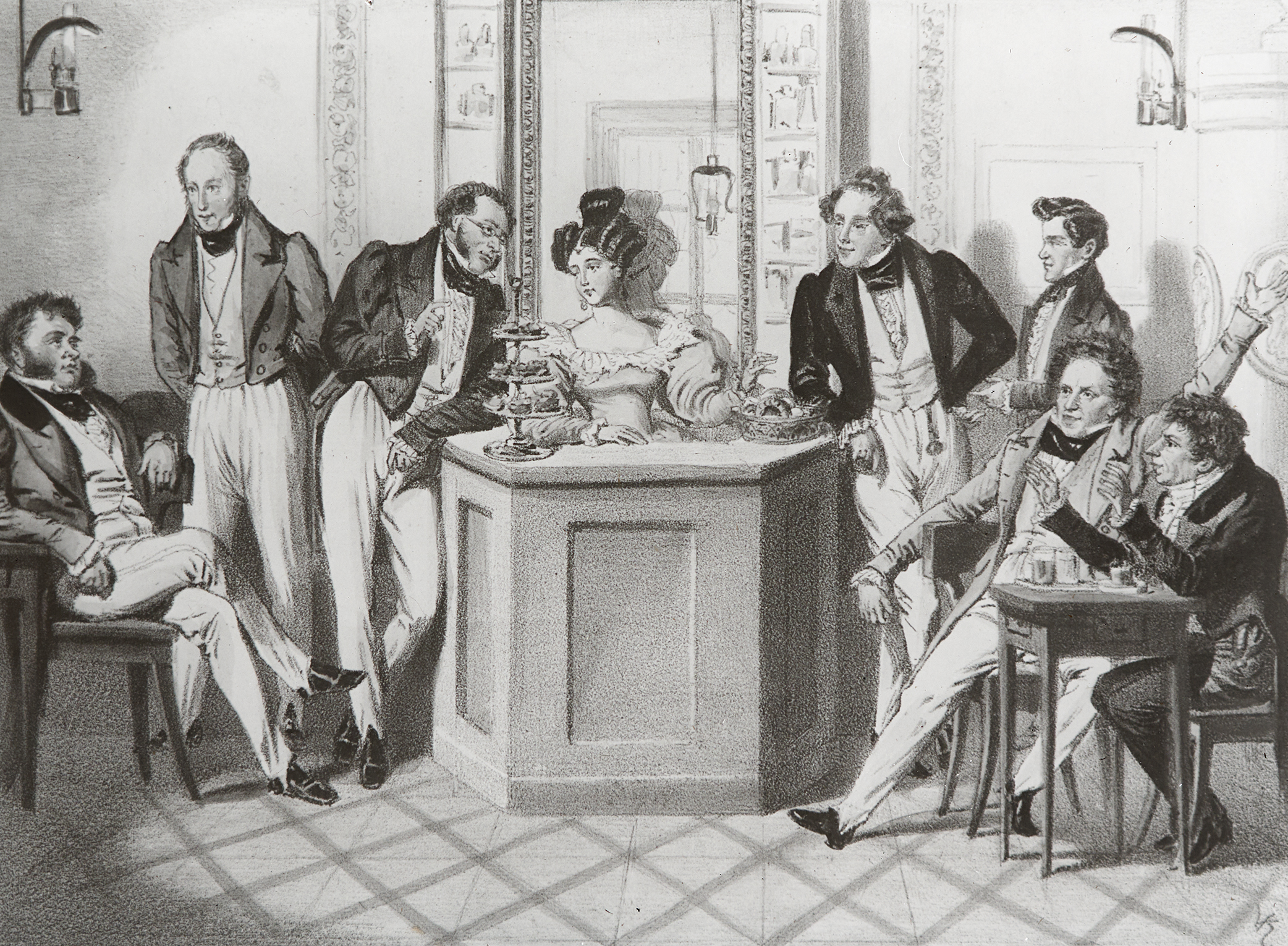 Hier zu sehen sind unter anderem Ferdinand Raimund, Johann Strauss' Vater, Joseph Lanner und Ignaz Franz Castelli, in einer geselligen Runde im Silbernen Kaffeehaus um 1825.