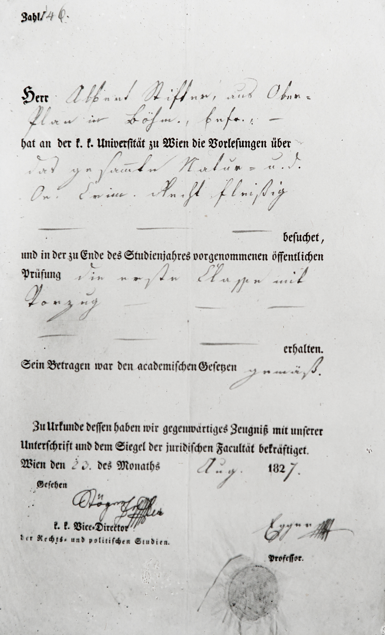 Adalbert Stifter studierte in Wien Juristik. Die Universität Wien und die juristische Fakultät stellten ihm zum Abschluss einer Vorlesungsprüfung ein erfolgsreiches Besuchszeugnis aus.