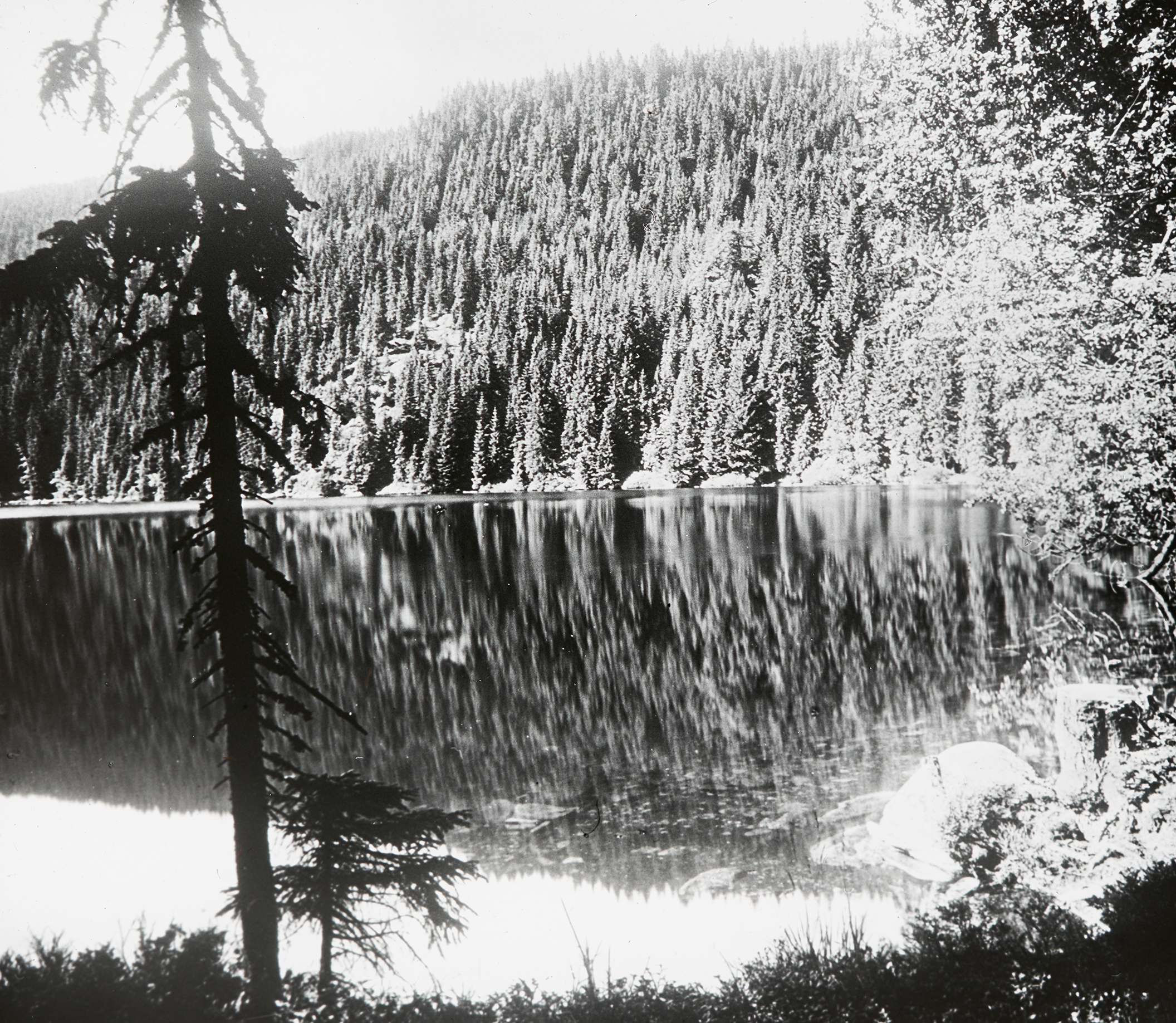 Ausblick auf einen See, der umgeben von Wald ist. An der Wasseroberfläche spiegeln sich die Bäume.