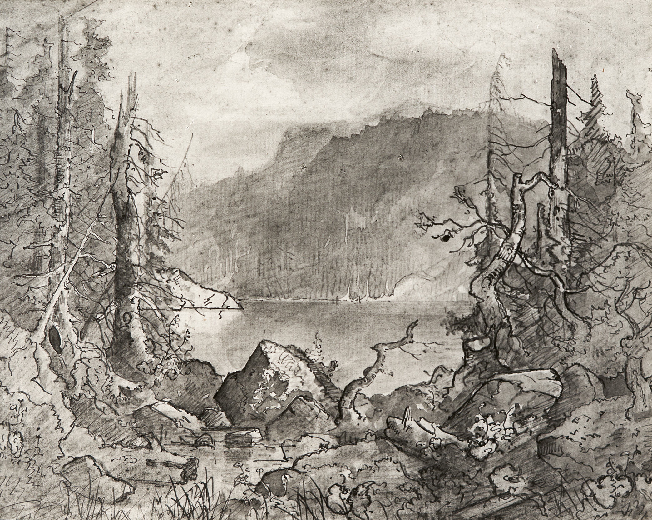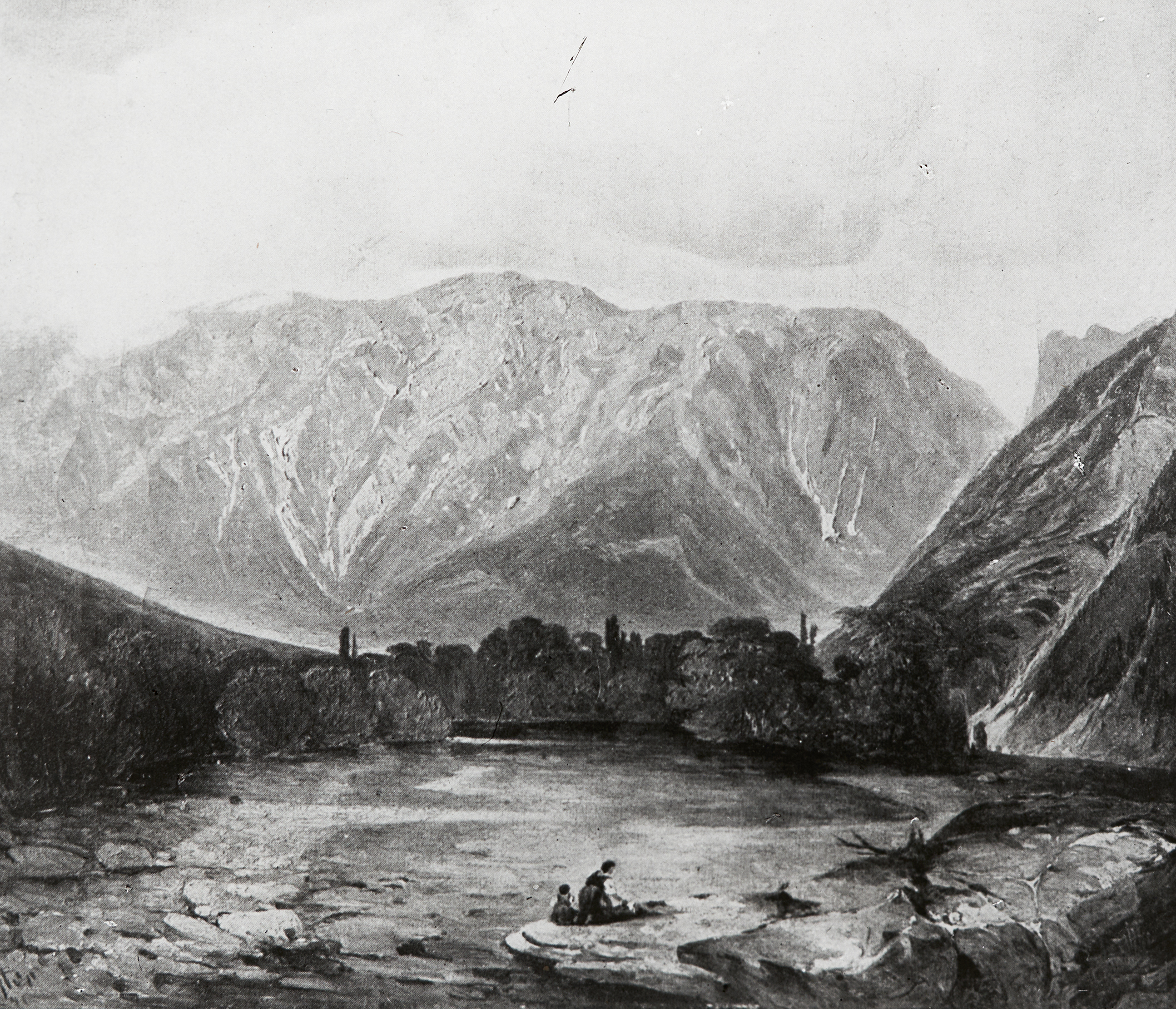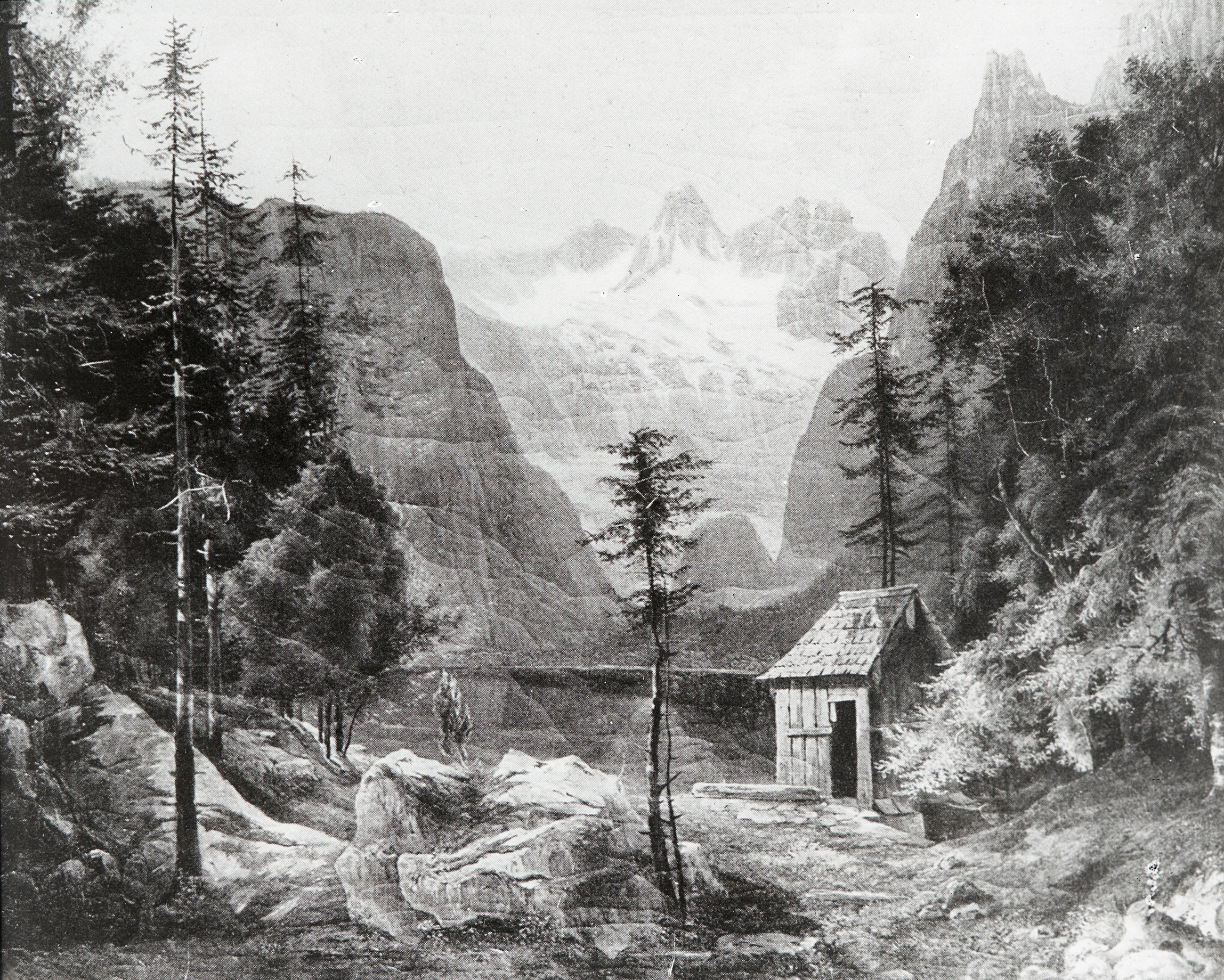 Gemälde von Adalbert Stifter. Man erkennt die Berglandschaft des Salzkammerguts und den Gosausee.