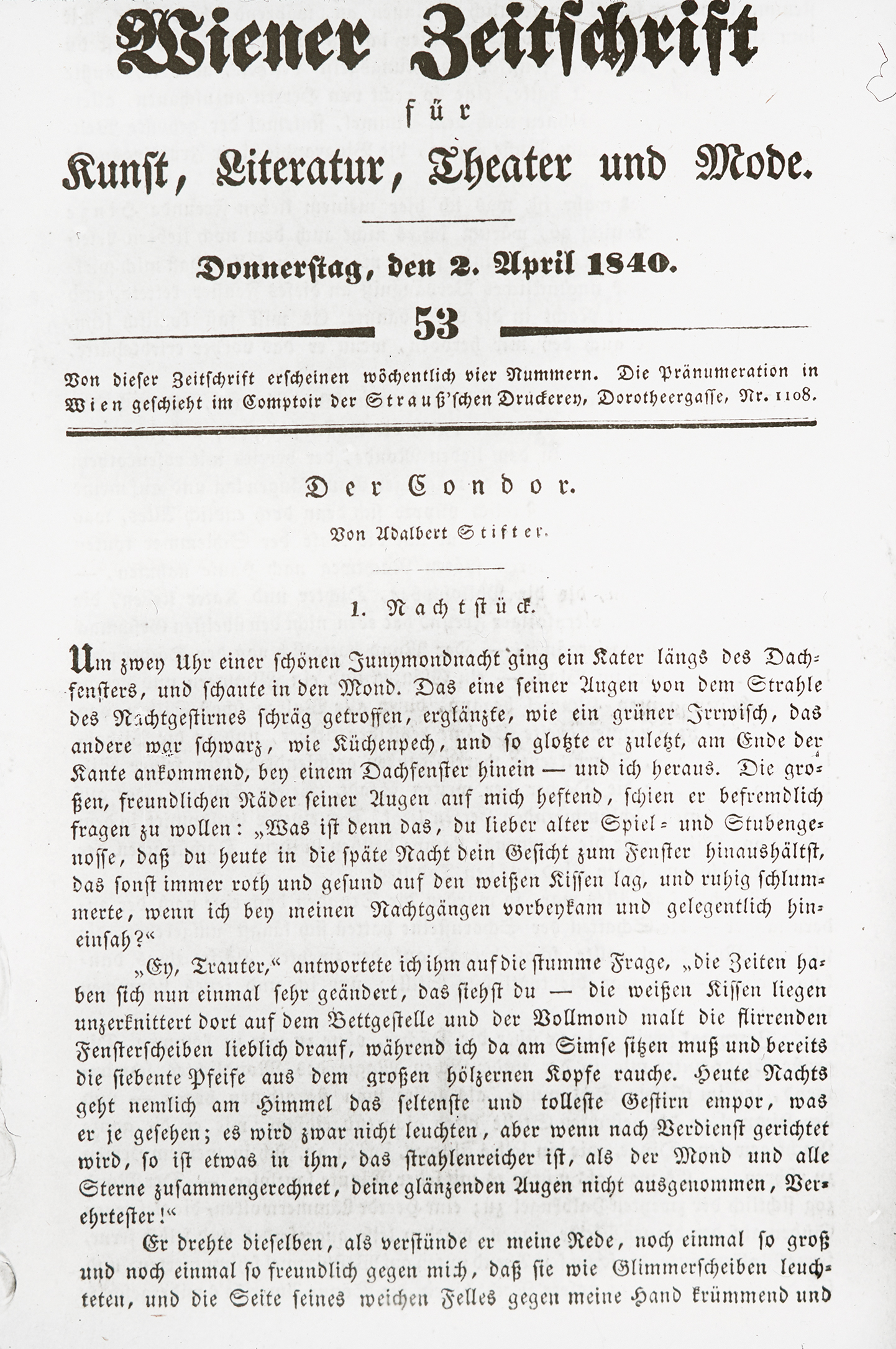 Eine Publikation Adalbert Stifters in der Wiener Zeitschrift für Kunst, Literatur, Theater und Mode vom Donnerstag, den 2. April 1840.