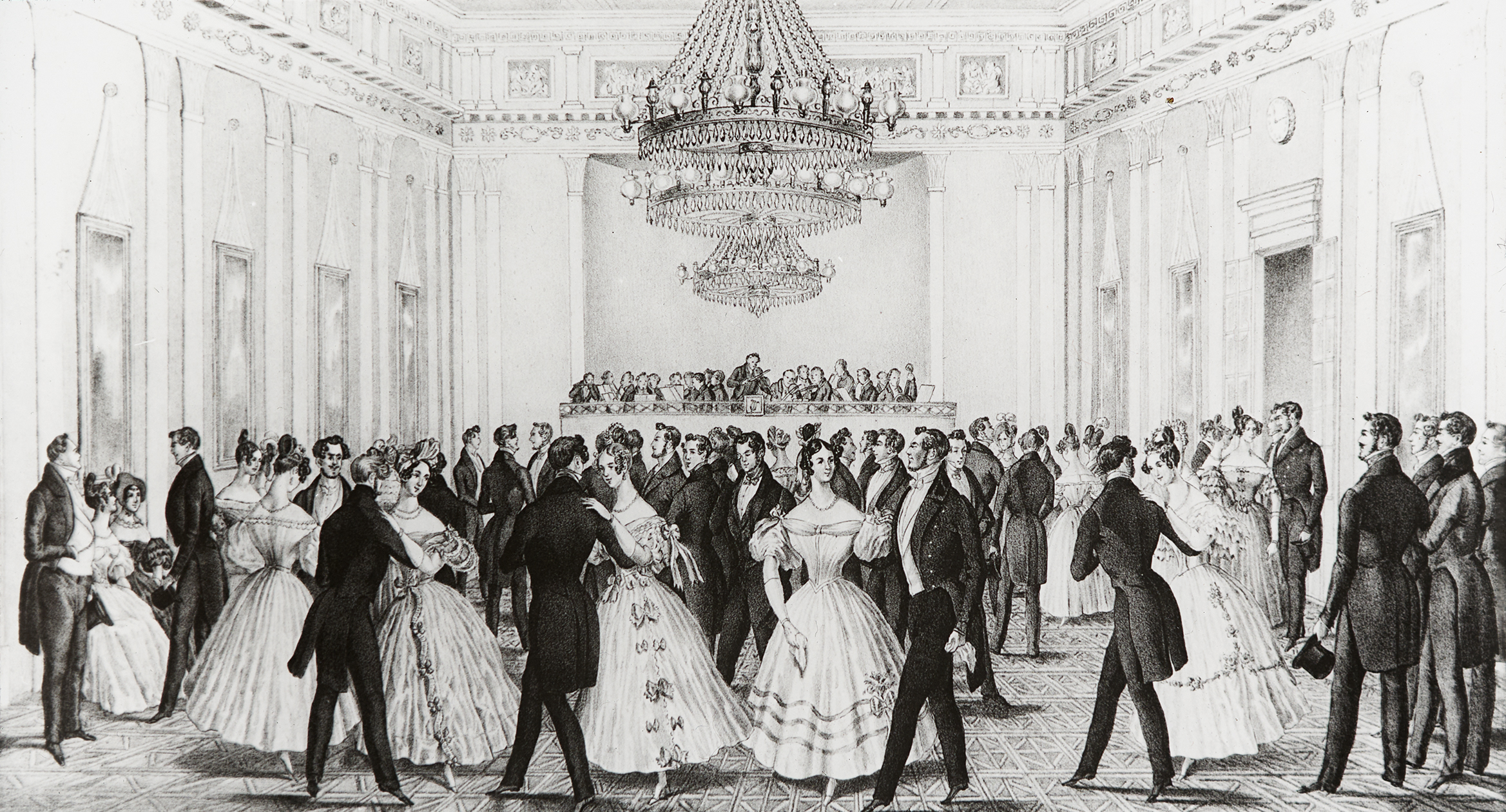 Tanzball in einem Ballsaal, von dessen Decke ein großer Kronleuchter hängt.