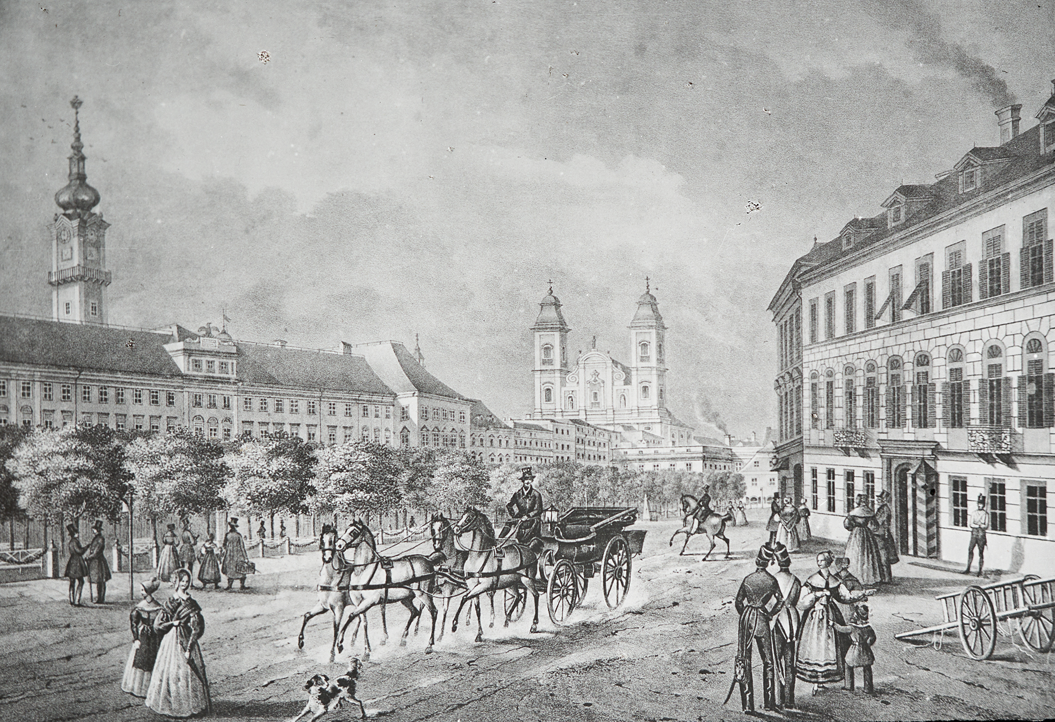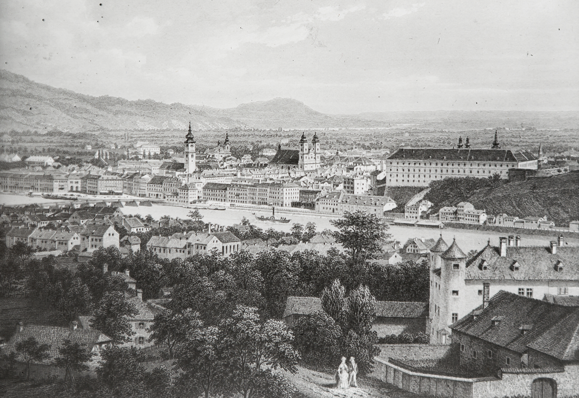 Eine Stadtansicht von Linz. Adalbert Stifter wohnte in seinen letzten Lebensjahren in Linz, der Hauptstadt des österreichischen Bundeslandes Oberösterreich. Das Stifterhaus befindet sich am heutigen Adalbert-Stifter-Platz 1 in Linz. Er starb 1868.