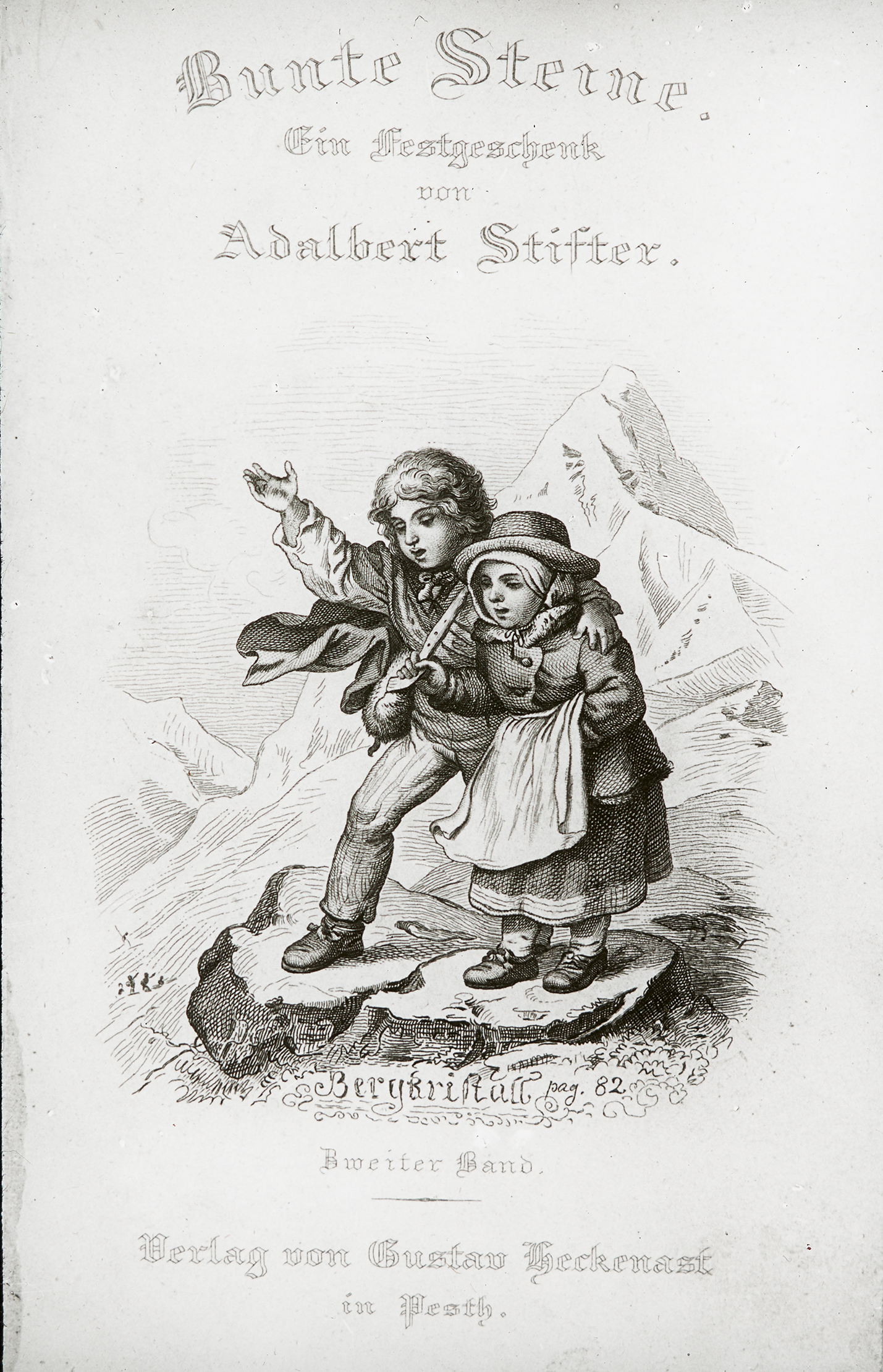 Titelblatt von "Bunte Steine. Ein Festgeschenk" von Adalbert Stifter. Zu sehen ist der Zweite Band, verlegt bei Gustav Heckenast. Dieser Band enthält die Erzählungen Bergkristall, Katzensilber und Bergmilch.