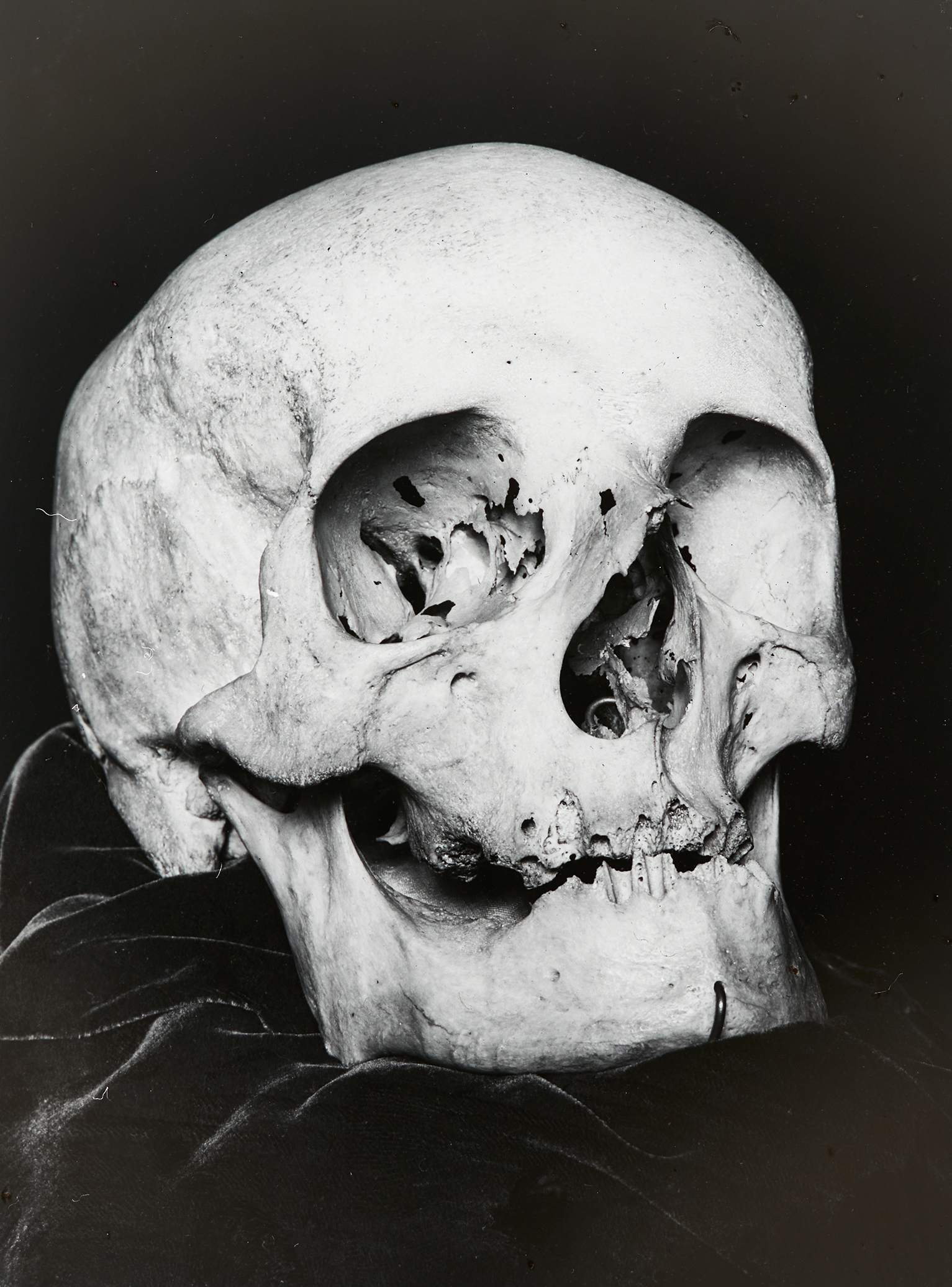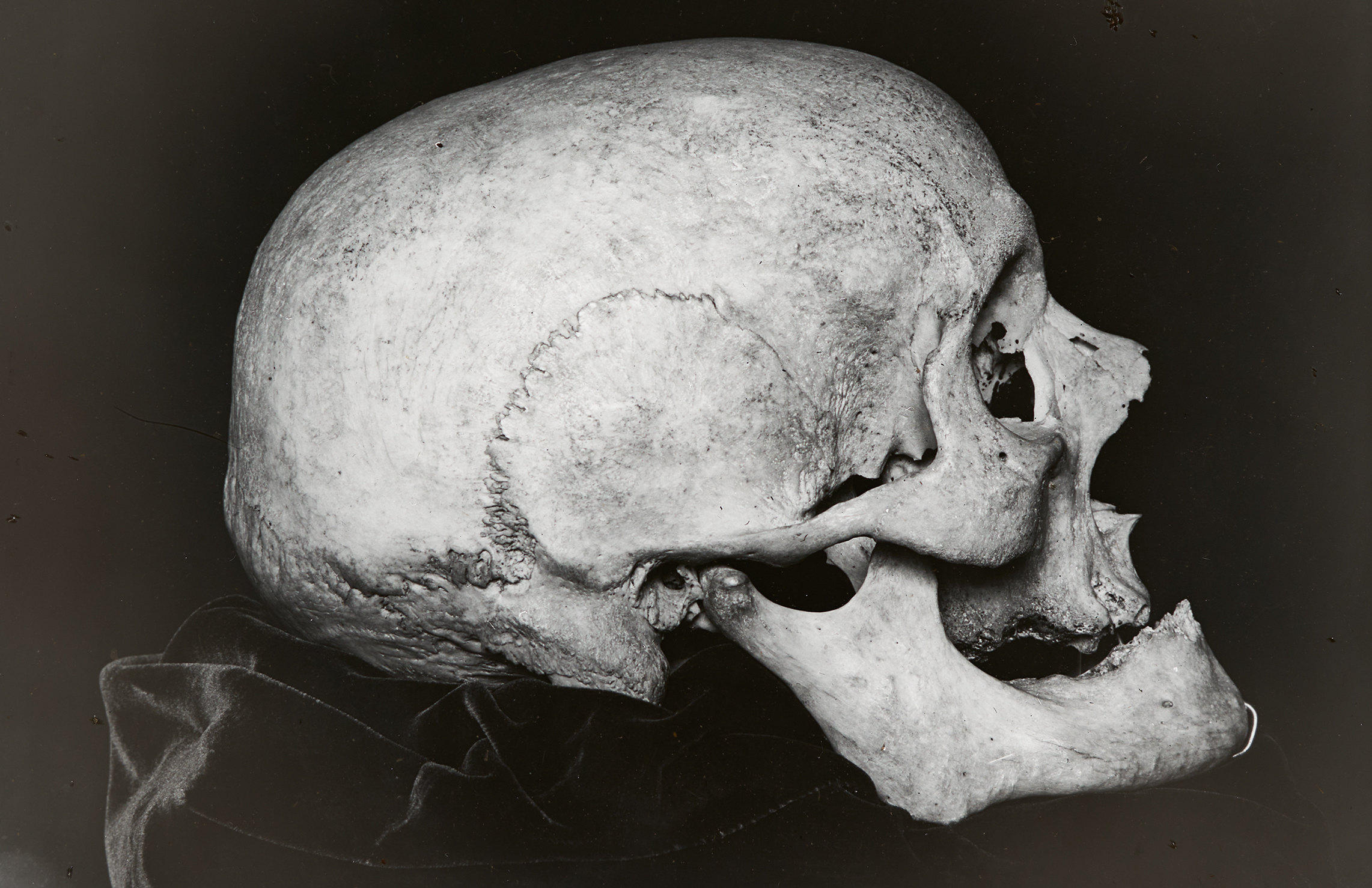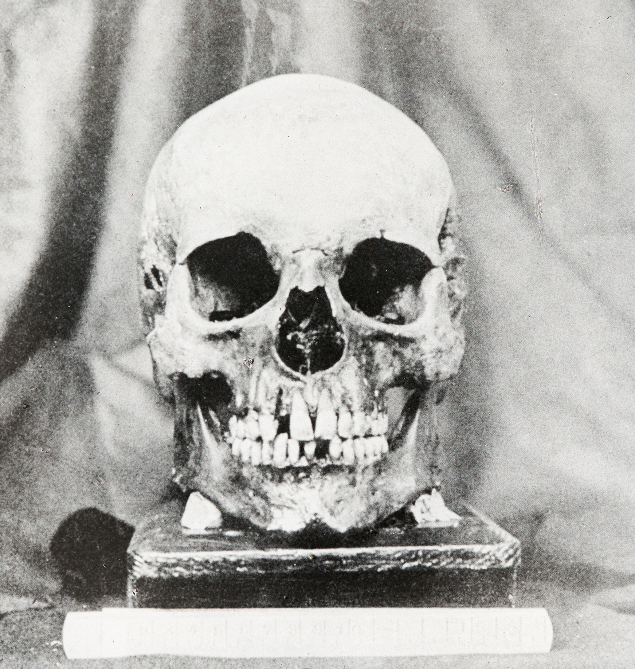 Eine Frontansicht des Schädels von Joseph Haydn. Er verstarb am 31. Mai 1809 in Wien, als die napoleonische Armee in die Hauptstadt vordrang. Als Todesursache wurde in der Wiener Zeitung Altersschwäche angegeben. Sein Schädel lag eine Zeit lang am Altar der Eisenstädter Bergkirche, bis er in den Sarkophag zu den übrigen Gebeinen übergestellt wurde.