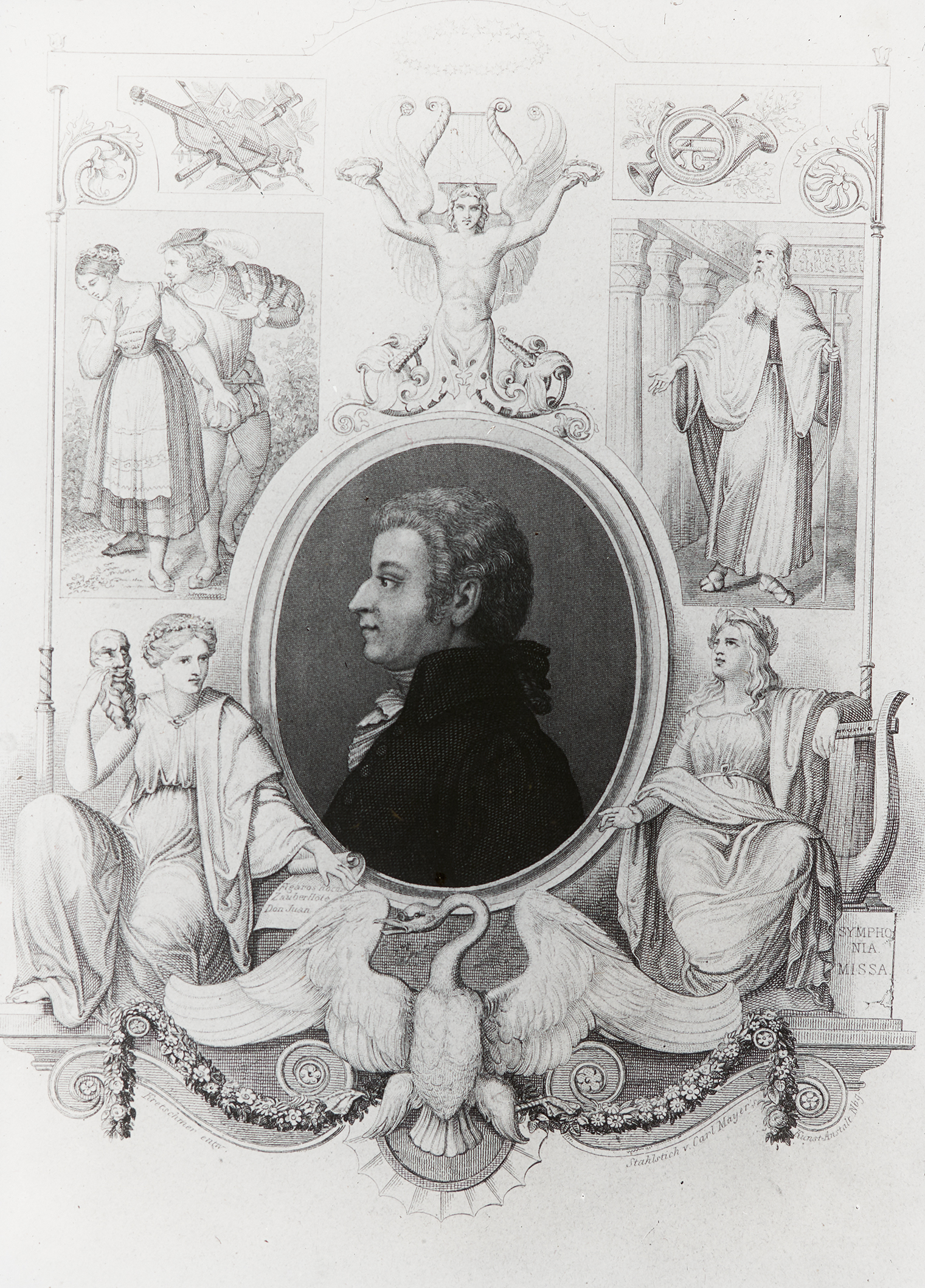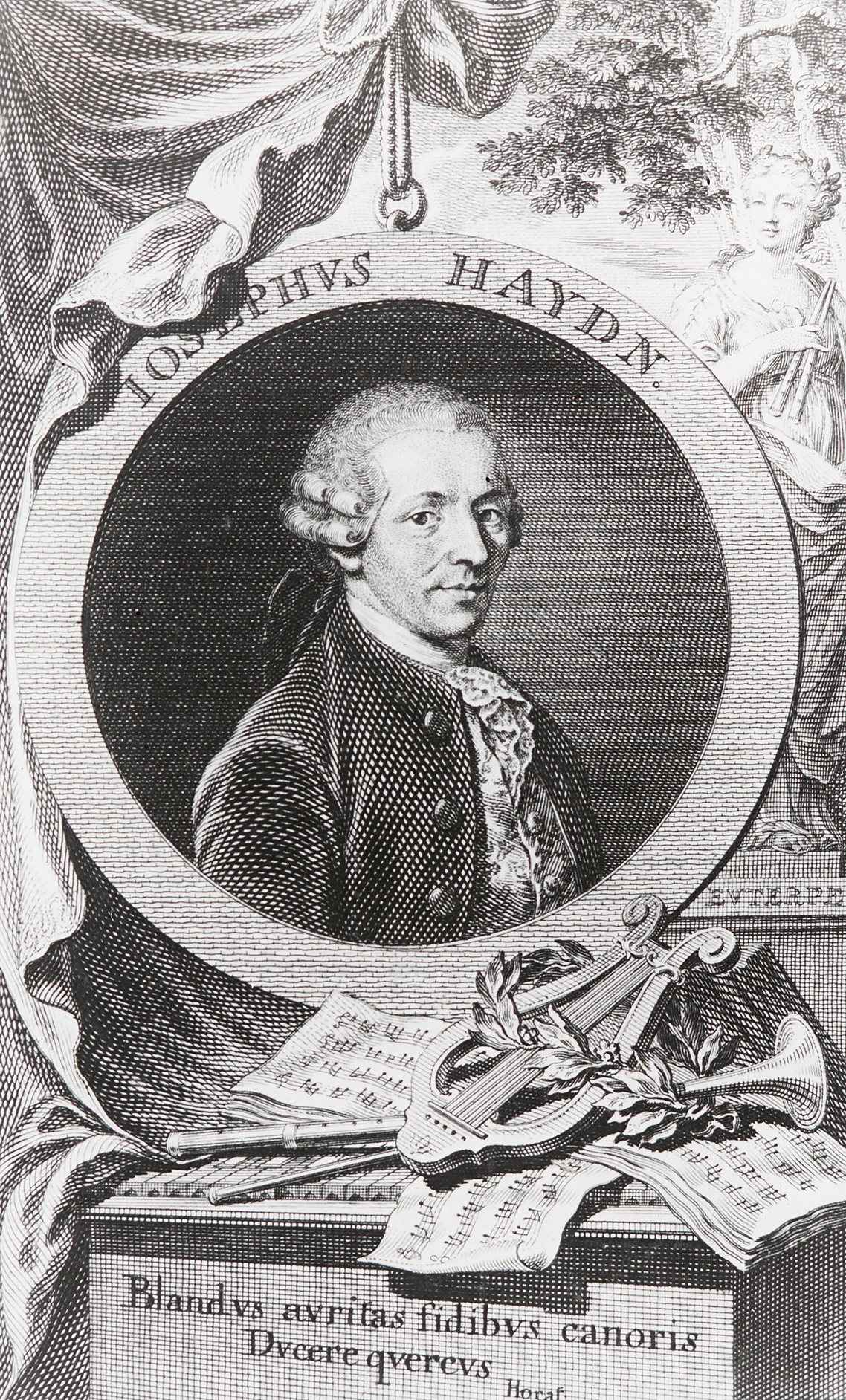 Ein Portrait von Joseph Haydn, das ihn bis zur Brust zeigt. Darunter befinden sich Notenblätter und Musikinstrumente sowie eine lateinische Inschrift, ein Zitat von Horaz.