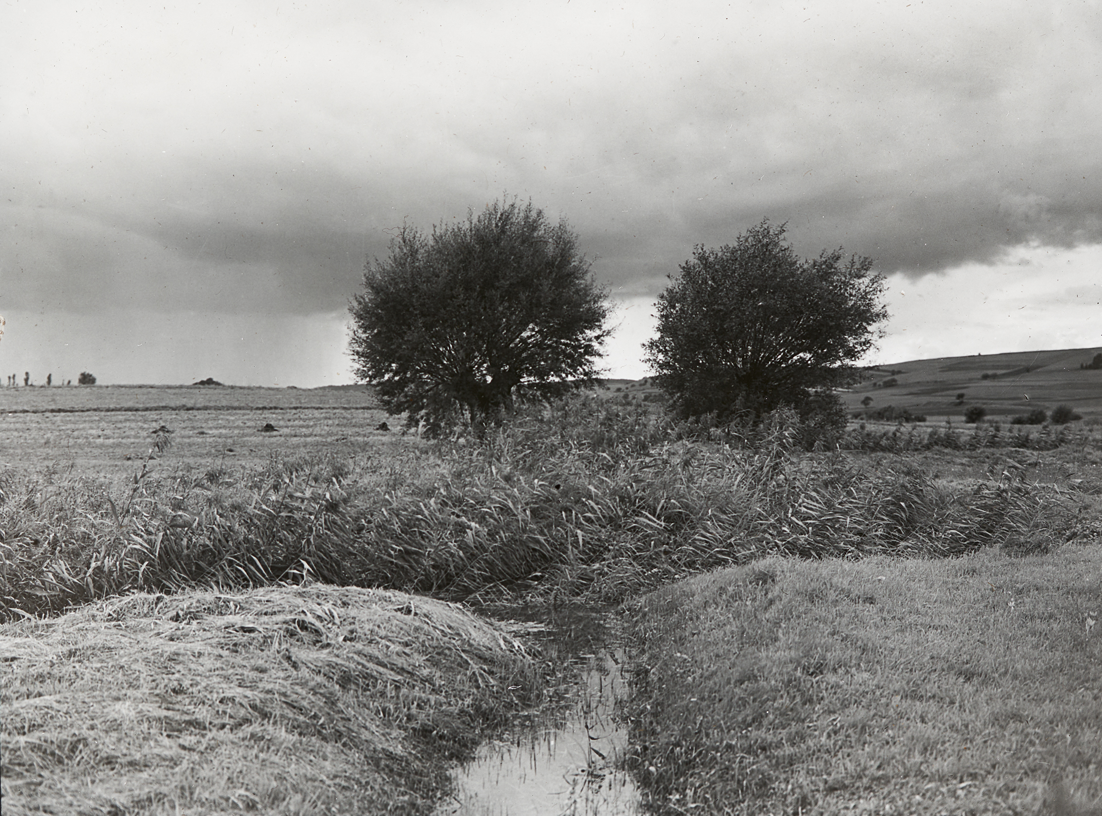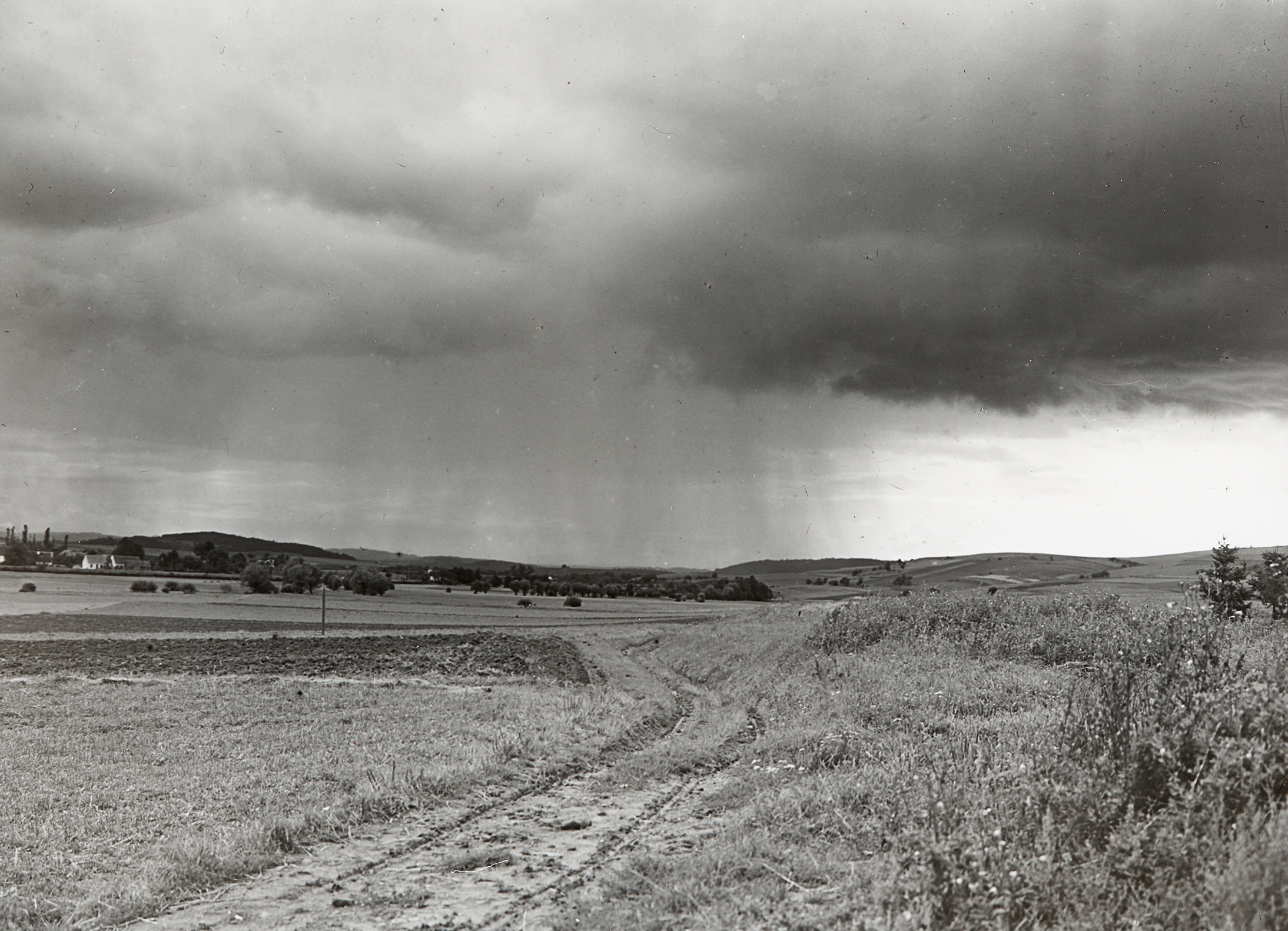 Bild von einer Landschaft, über der Gewitterwolken aufziehen.