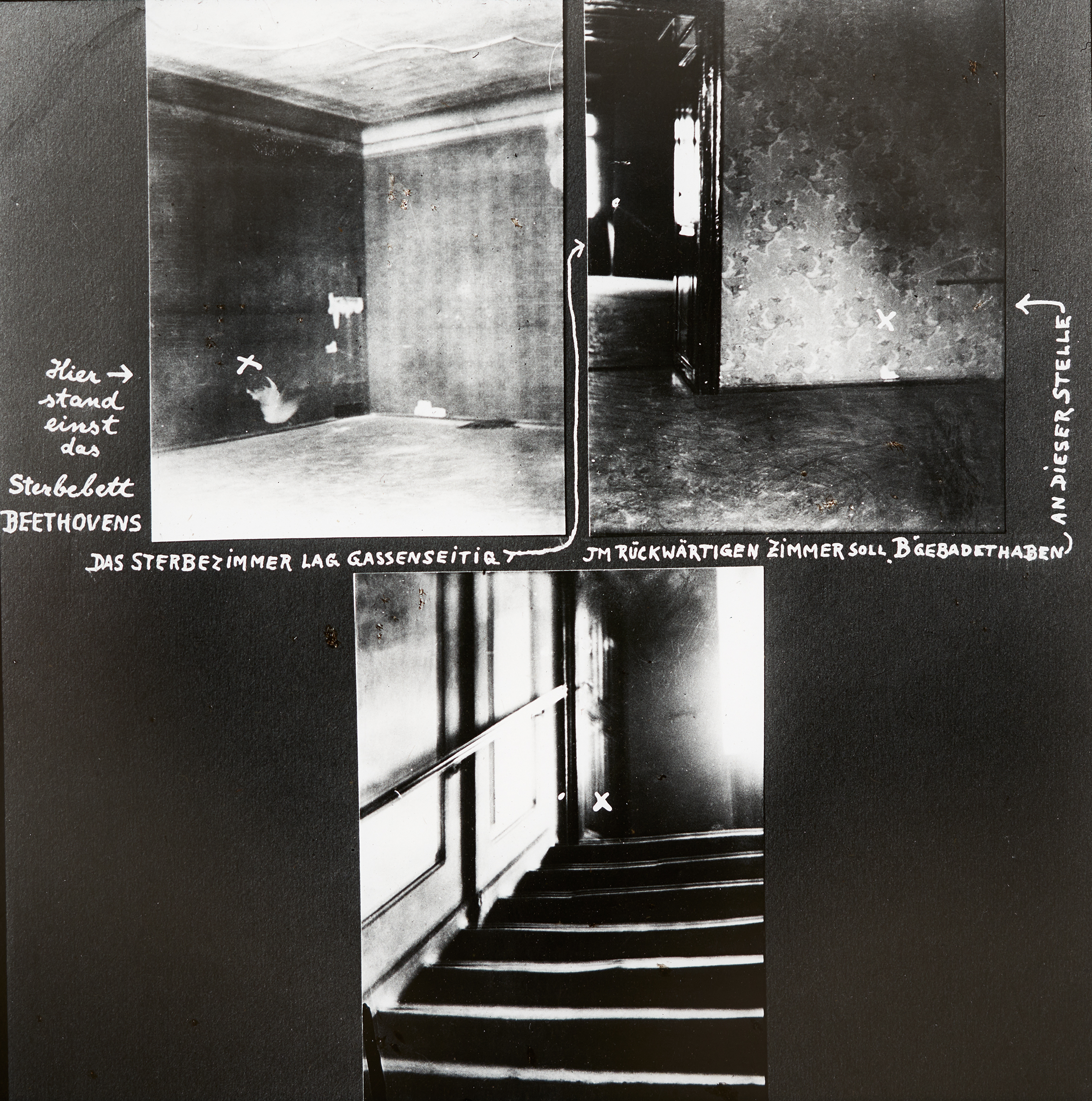 Hier ist in drei Bildern dargestellt und beschrieben, wie die Wohnung, in der Beethoven verstorben ist, zum damaligen Zeitpunkt aufgebaut sein sollte.