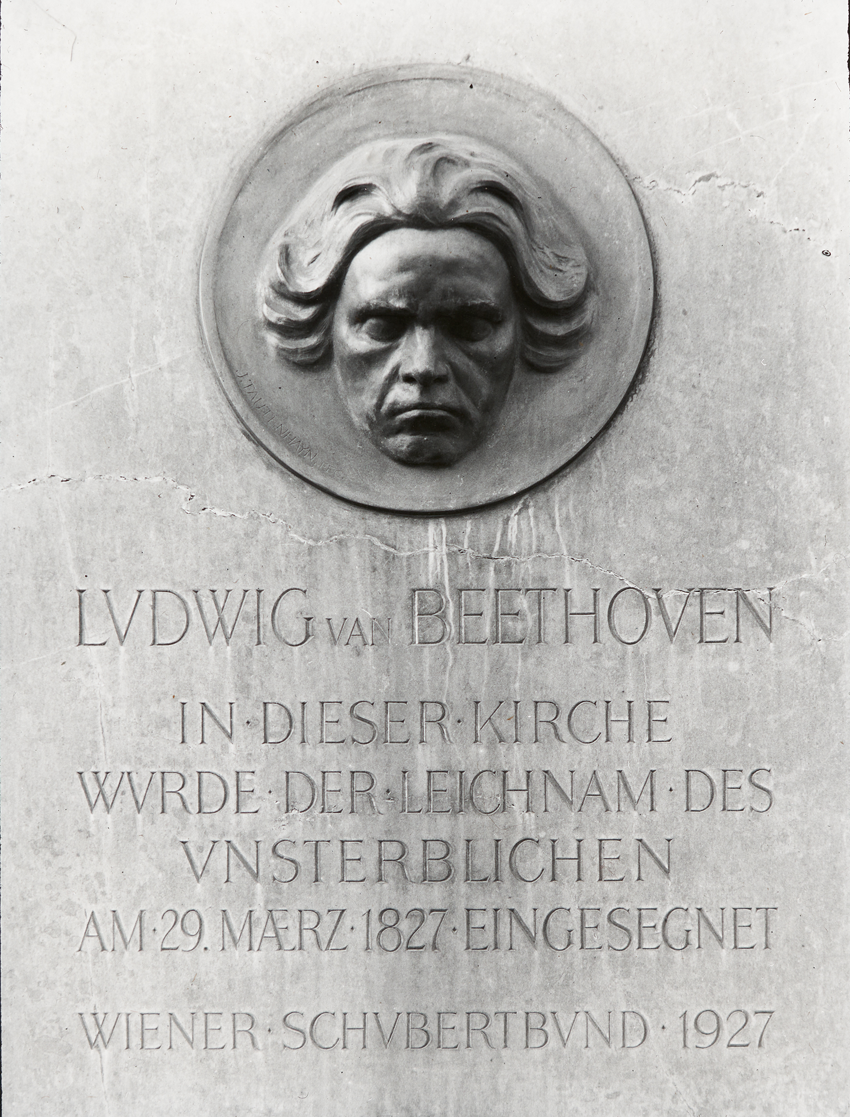 Ludwig van Beethoven wurde am 29. März 1827 postum gesegnet. An der Kirche, in der die Segnung stattfand, ist diese Gedenktafel angebracht. 1927 wurde dies durch den Wiener Schubertbund veranlasst.