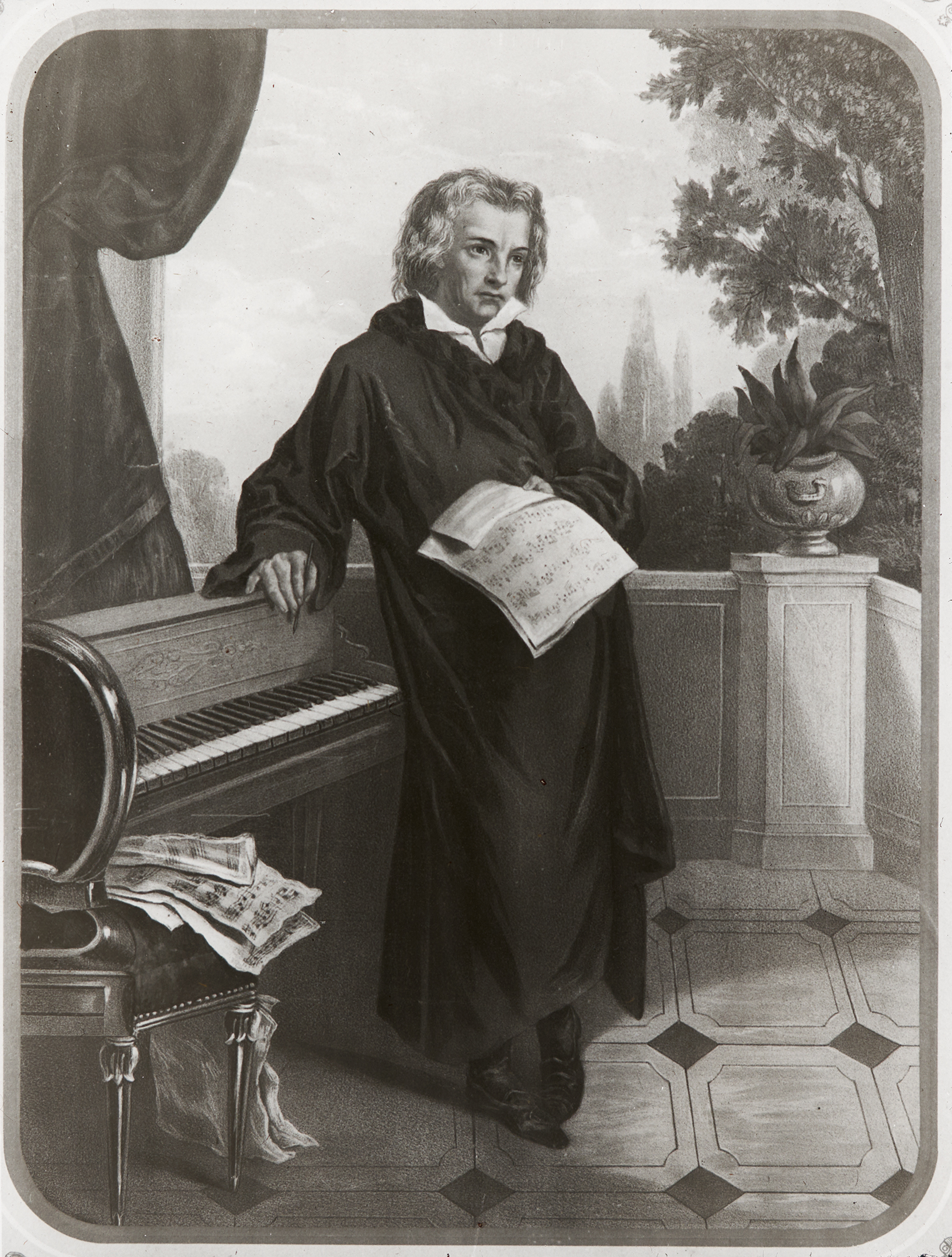 Beethoven, stehend am Klavier beim Komponieren.