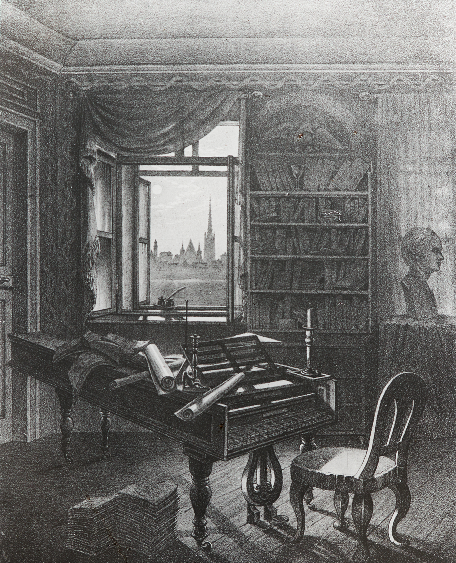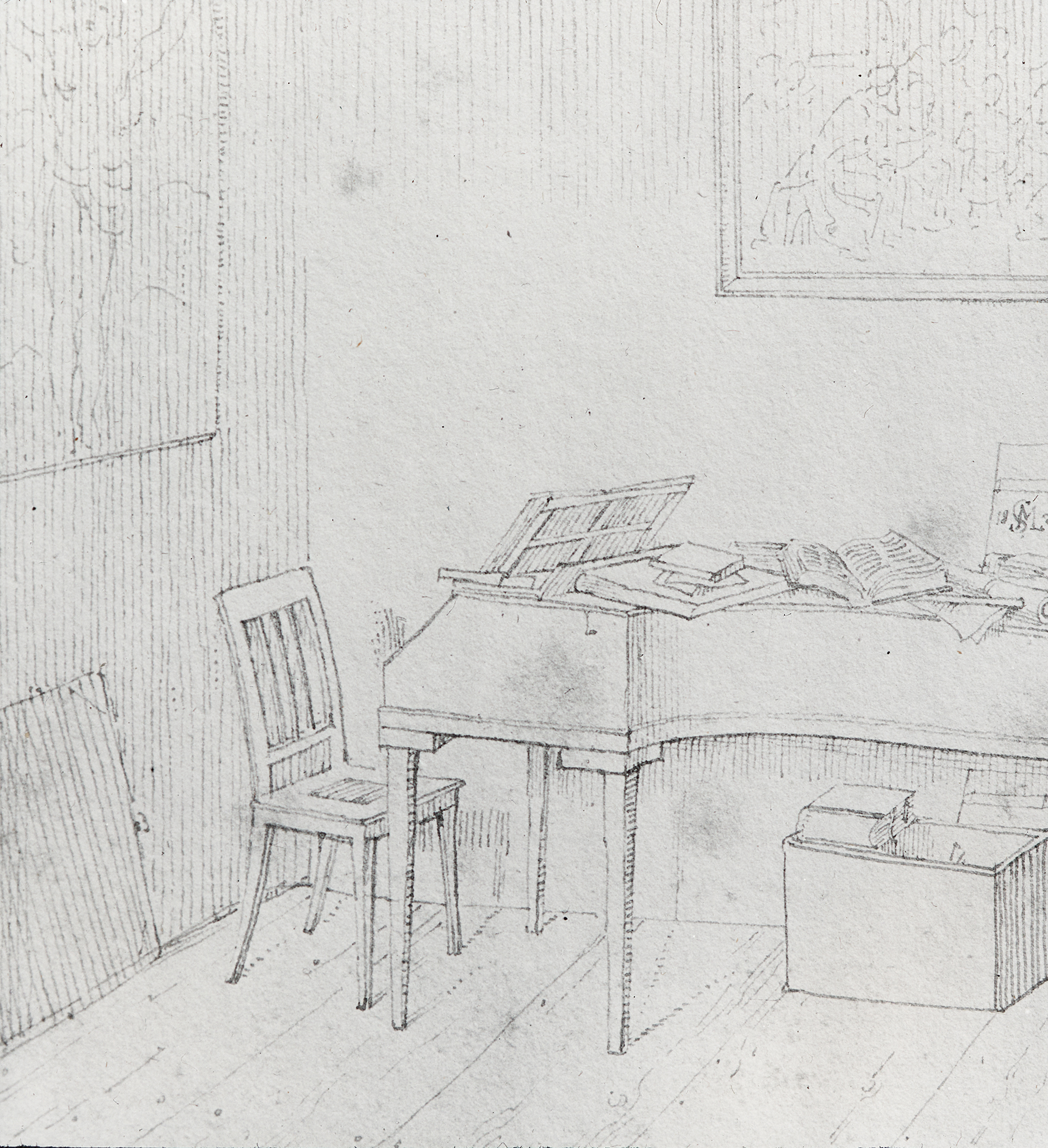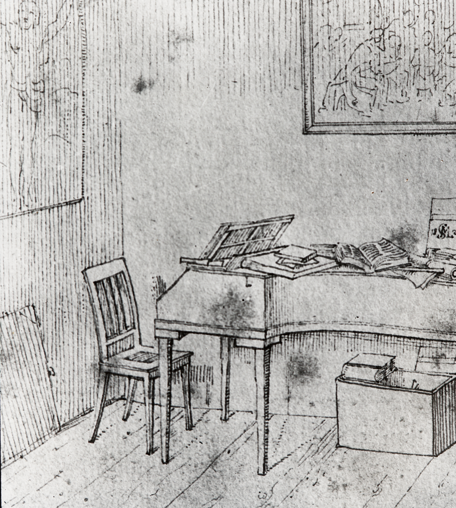 Zum Zeitpunkt seines Todes sah Beethovens Zimmer so aus. Es war sein Studier- und Komponierzimmer.
