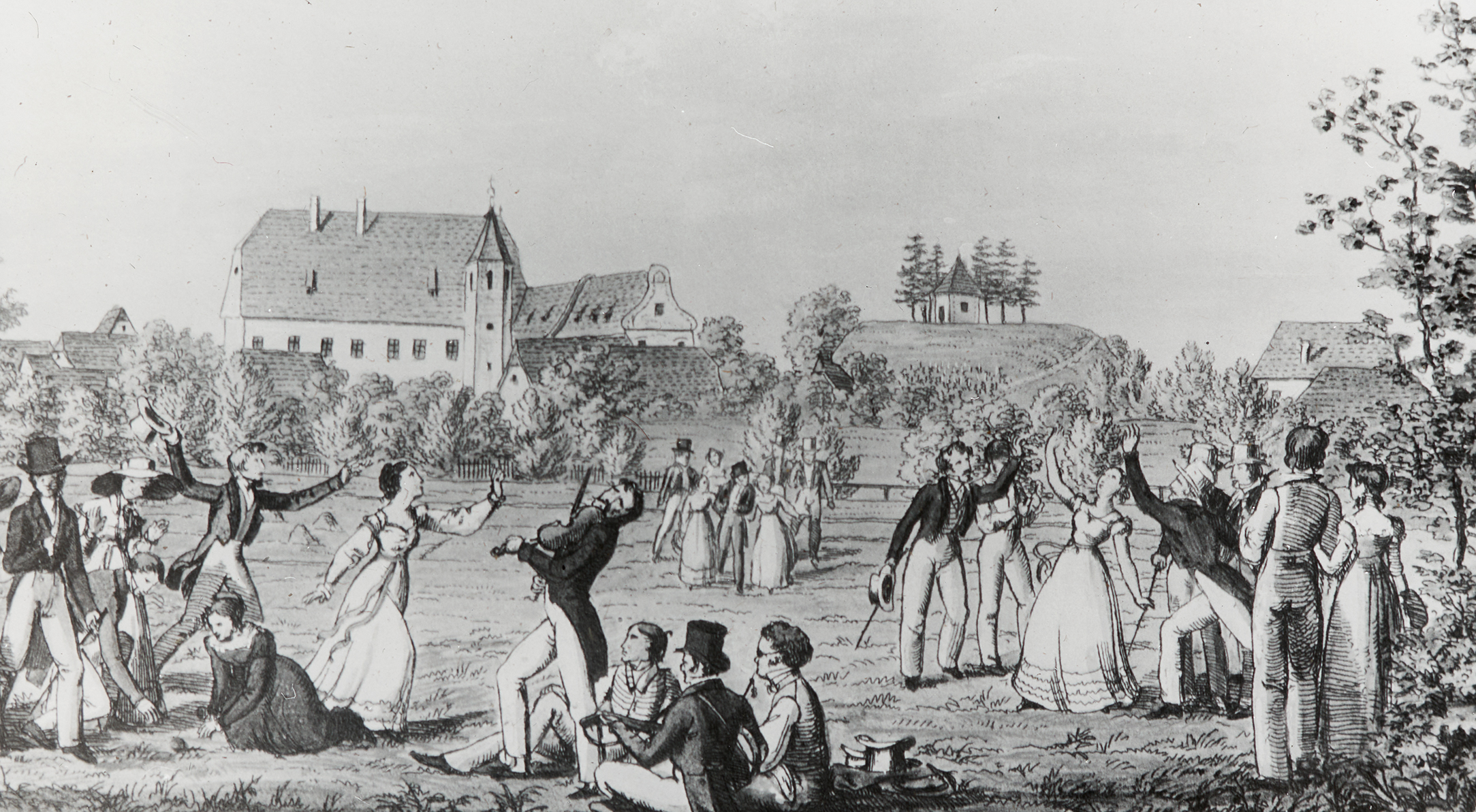 Franz Schubert und seine Freunde sitzen im Vordergrund dieser Szenerie, hier wird auf einem Feld mit Bällen gespielt, in der Ortschaft Atzenbrugg.