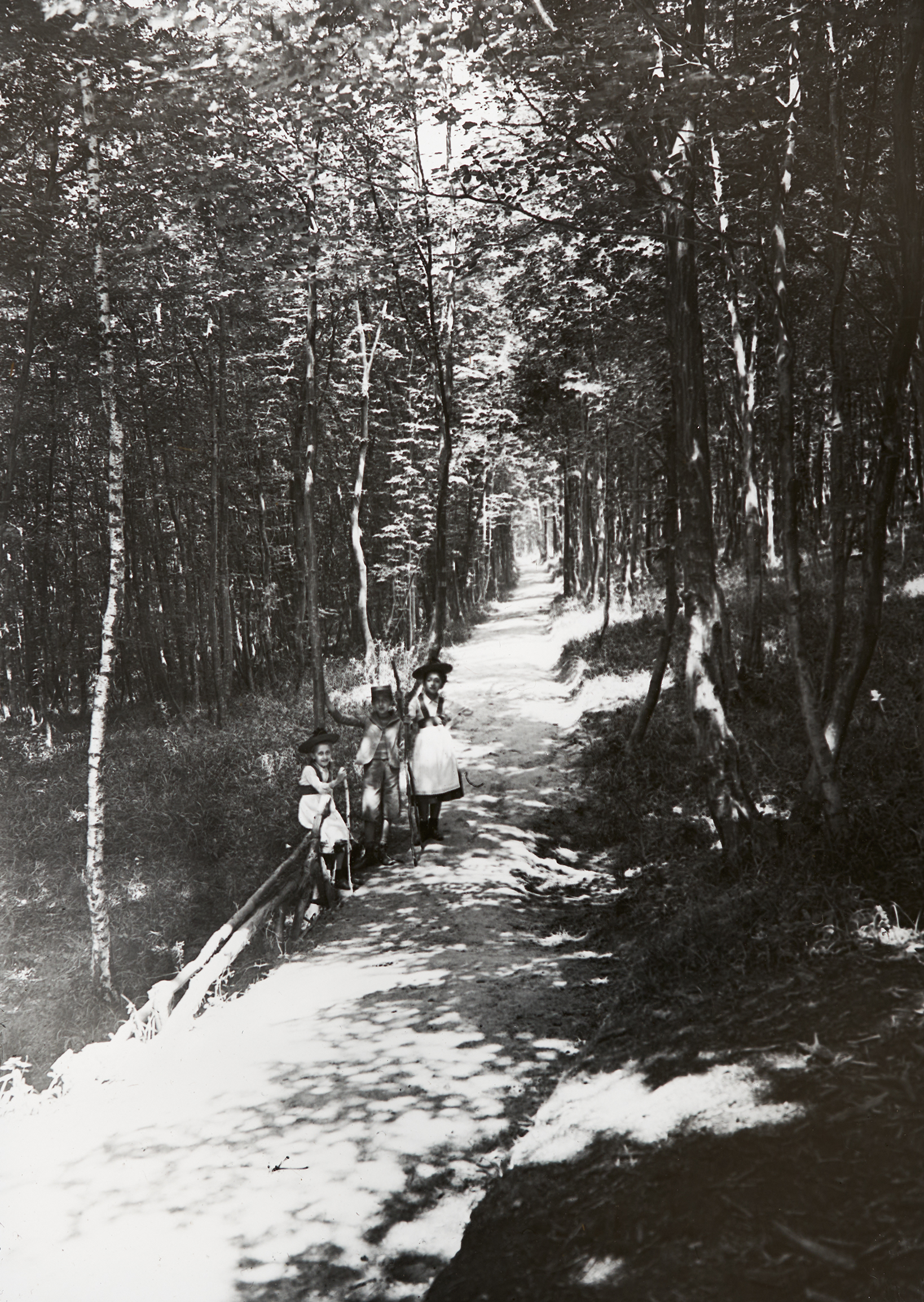 Eine Gruppe von Kindern, die sich an einer Lichtung zwischen Bäumen befinden.