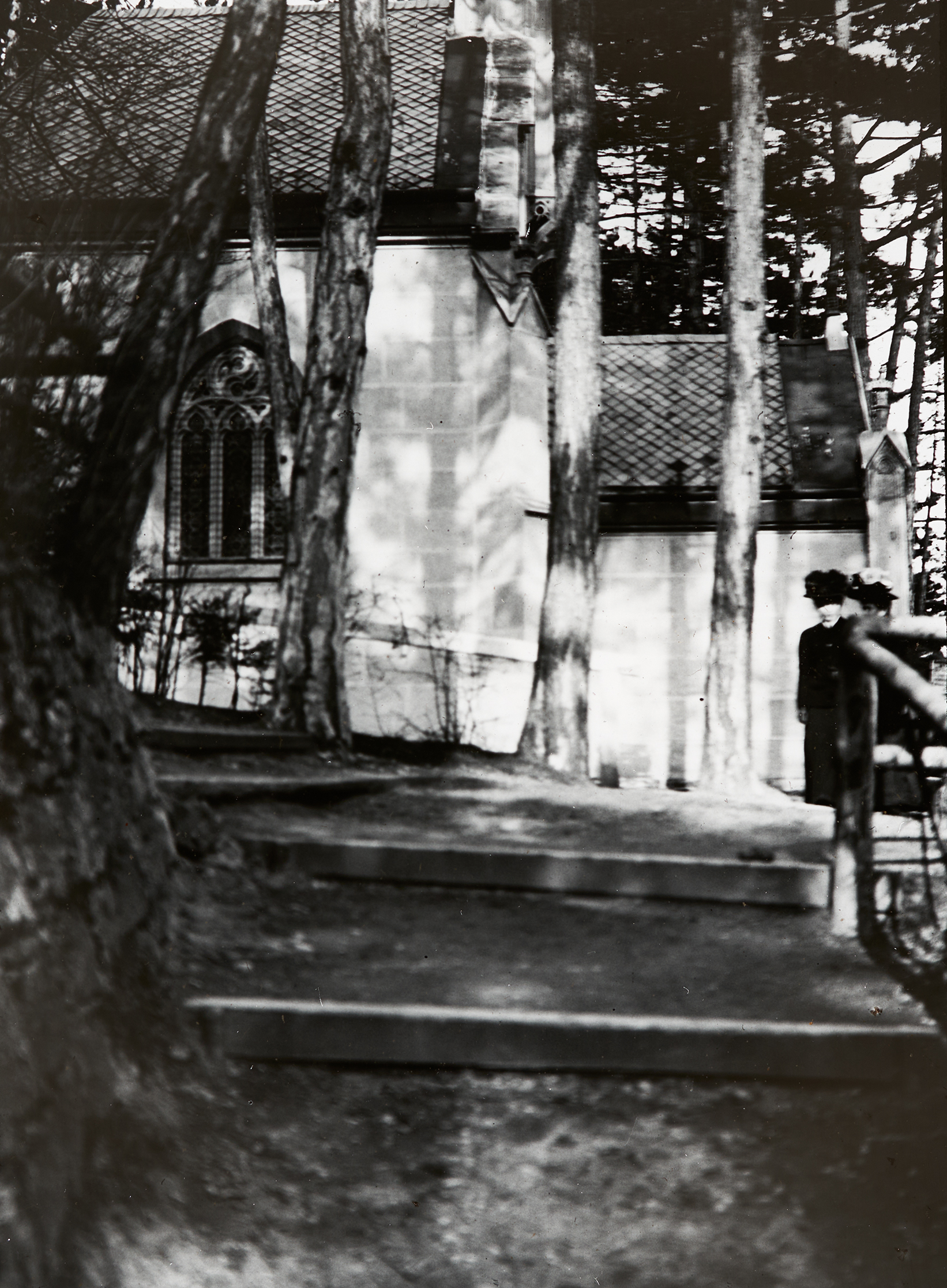 Die Stufen zu einer Kapelle im Wald.