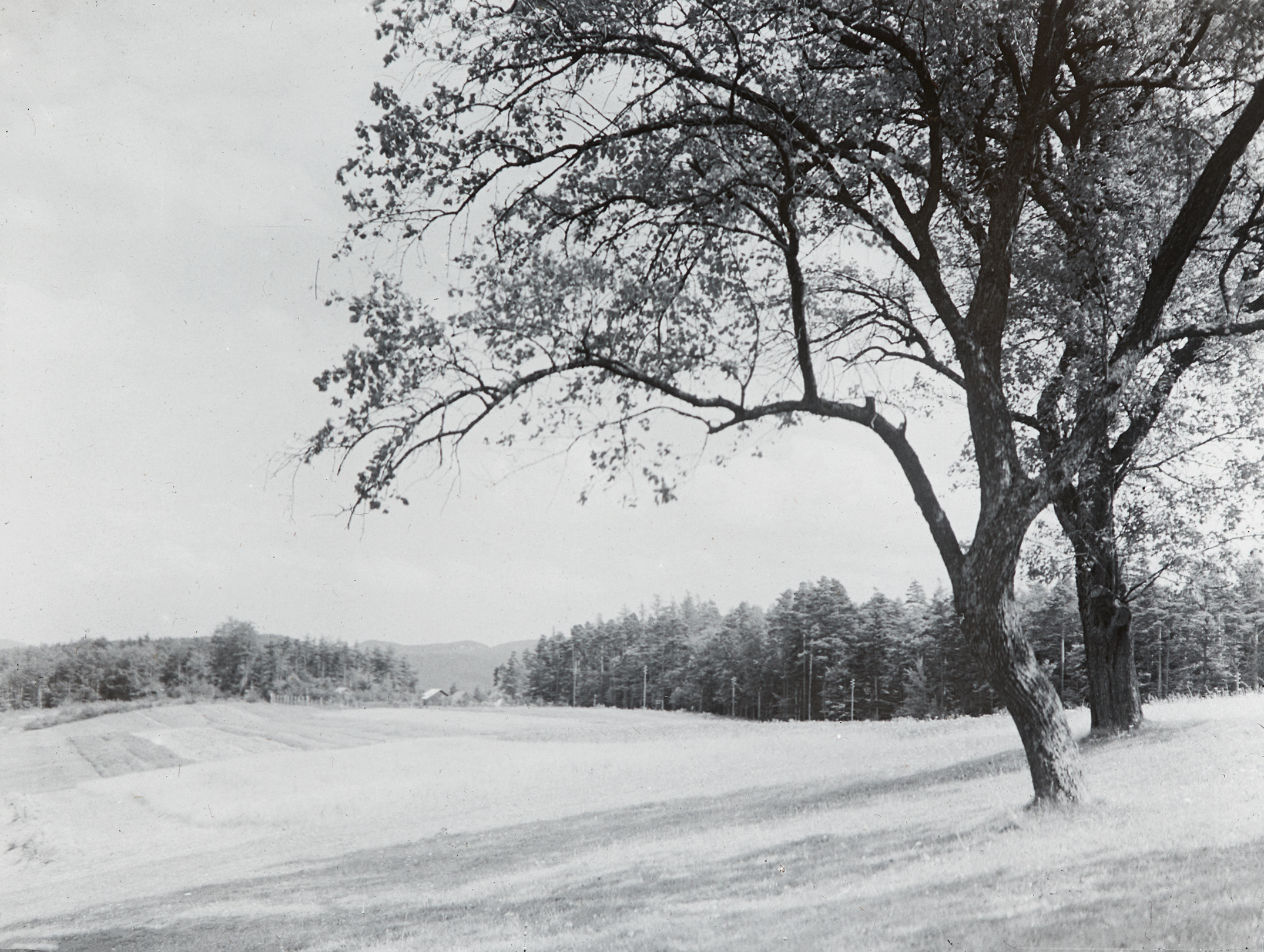 Ein Feld, in dem zwei Bäume stehen.