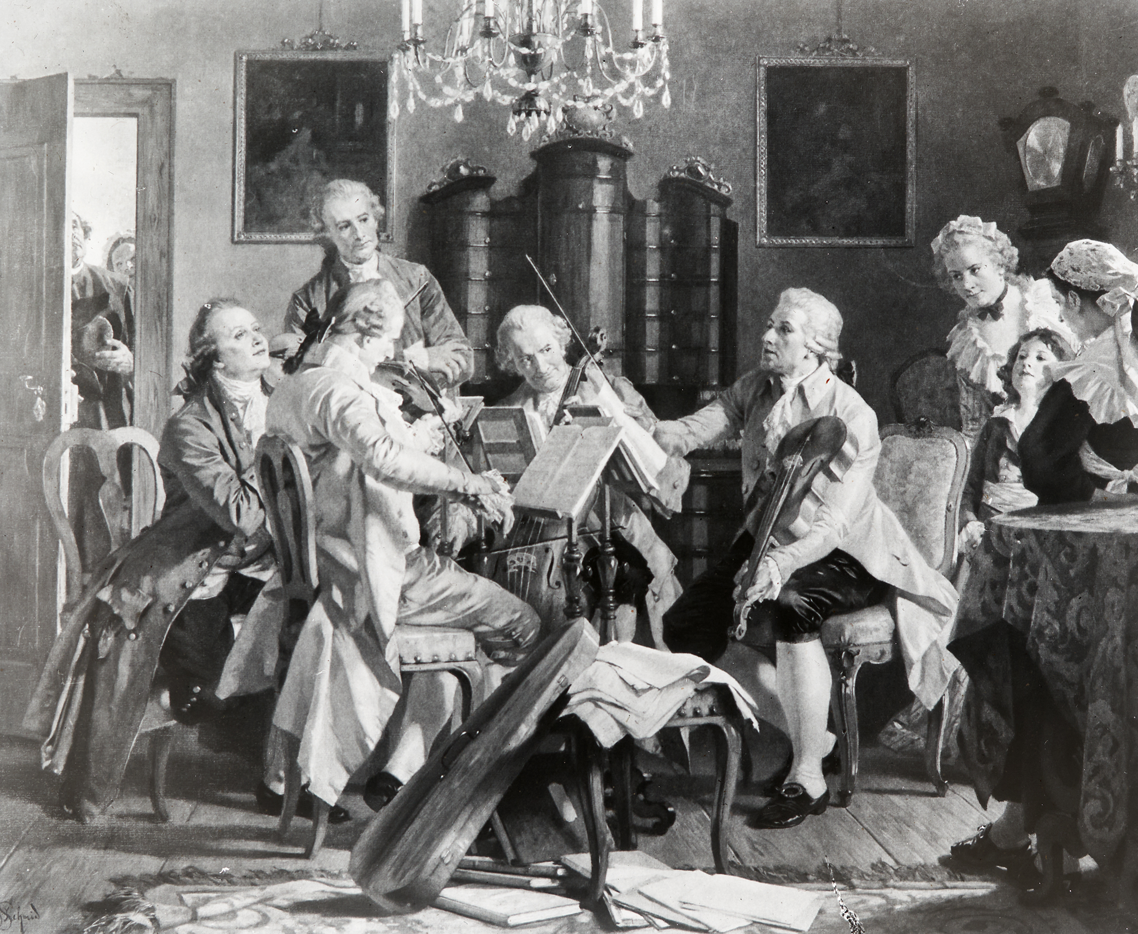 Joseph Haydn dirigiert dieses Streicherquartett. Durch die offene Tür sehen Leute zu.
