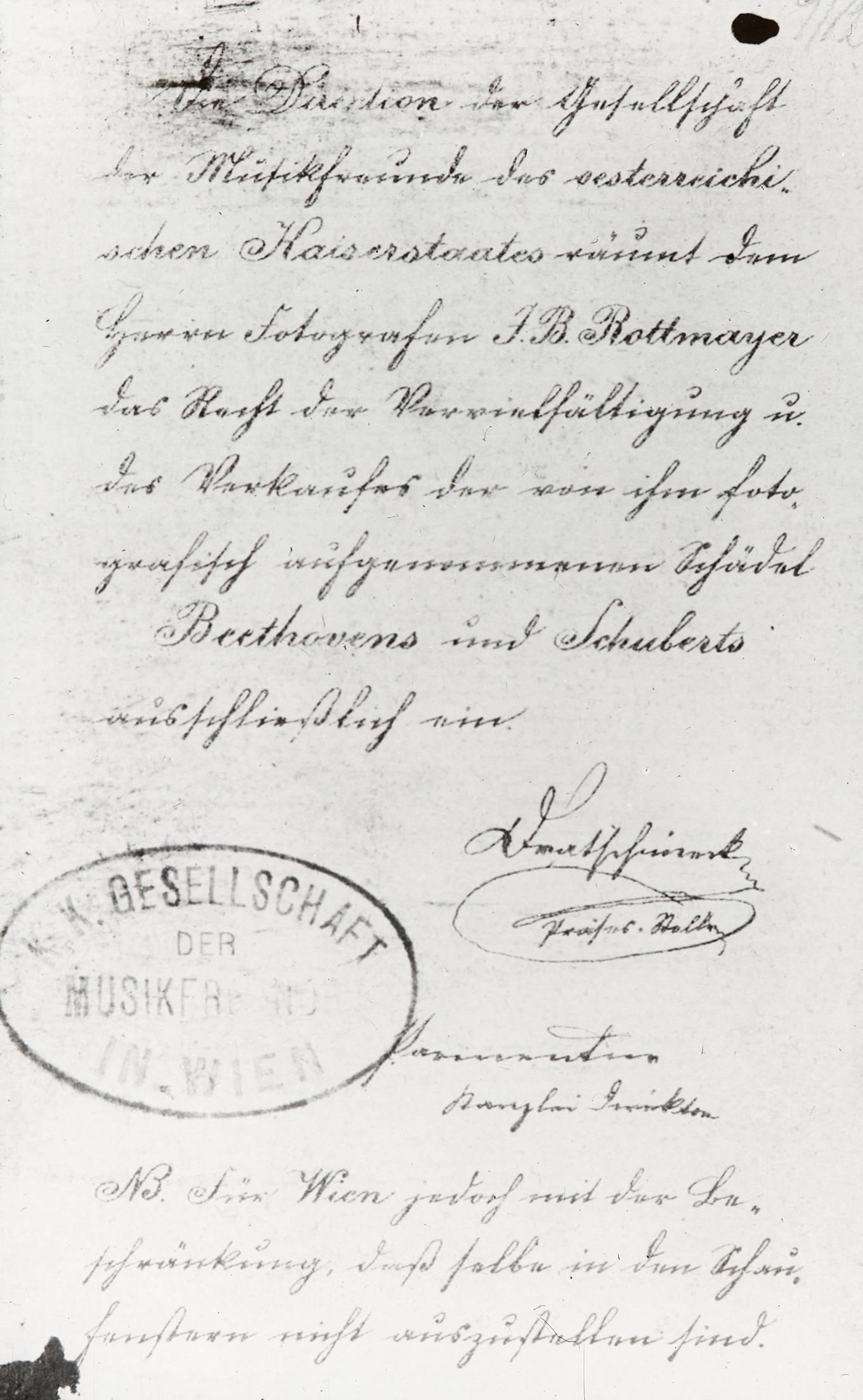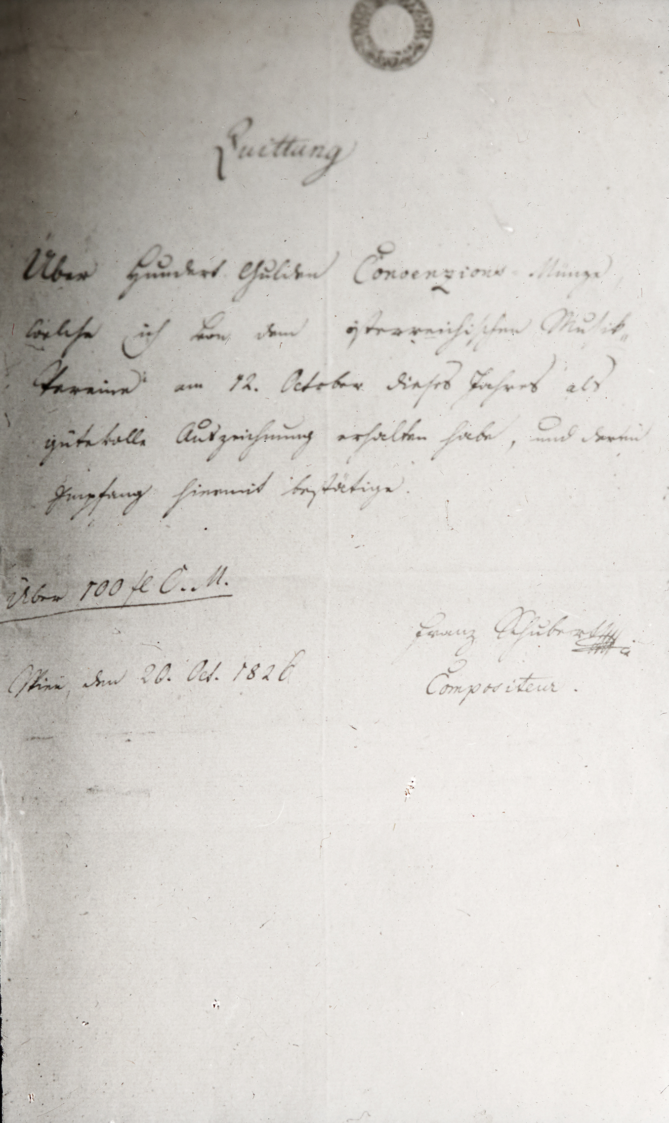 Über hundert Gulden Convenzions Münze, dieselbe ich für österreichische Musik am 12. Oktober als gütevolle Auszeichnung erhalten habe, und das ... Wien am 20. Oct. 1826 Franz Schubert Compositeur