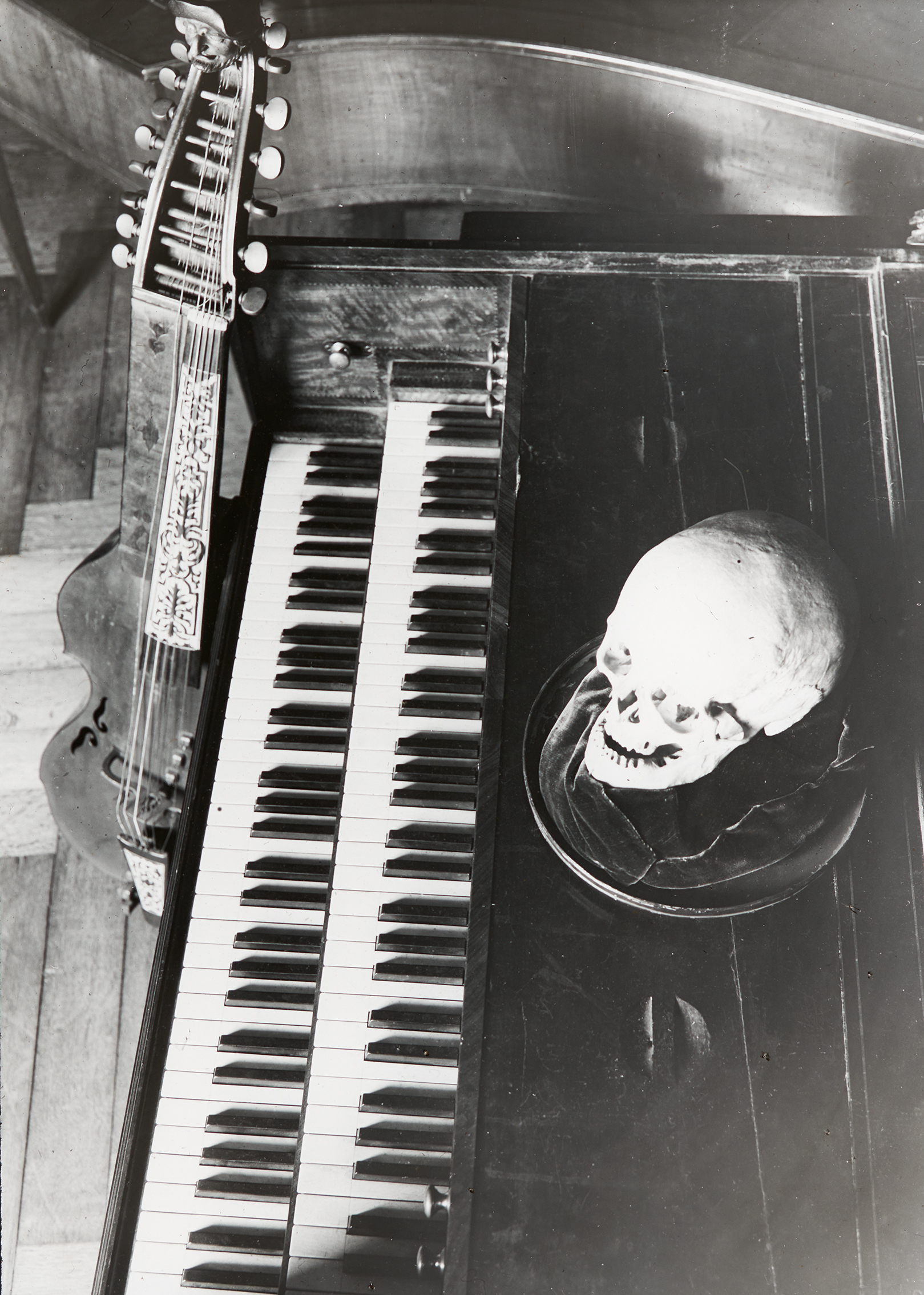 Der Totenschädel von Joseph Haydn auf einem zweireihigen Flügel.