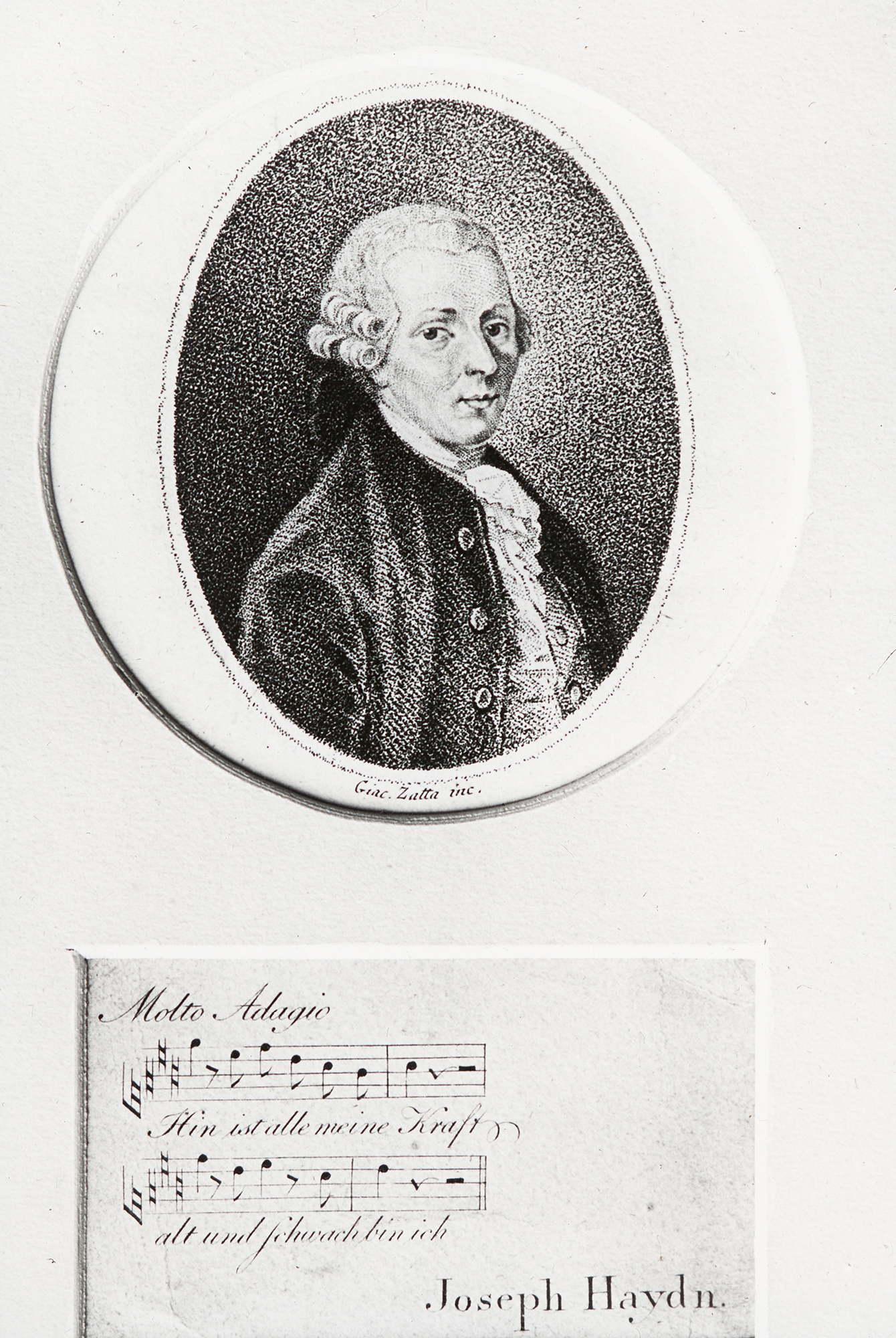 "Hin ist alle meine Kraft alt und schwach bin ich" Ein Portrait von Joseph Haydn, das darunter mit Notenzeilen versehen ist.