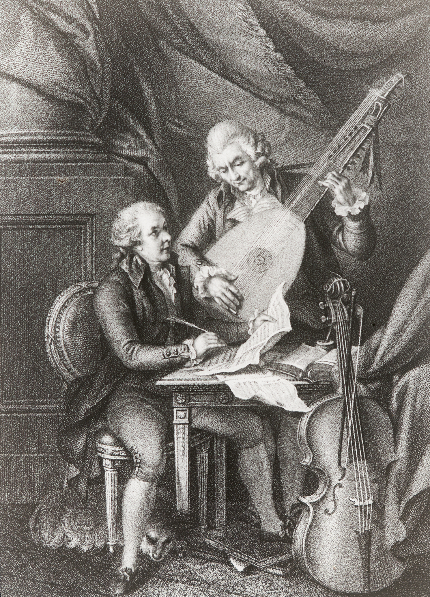 Joseph Haydn und Wolfgang Amadeus Mozart beim Komponieren.