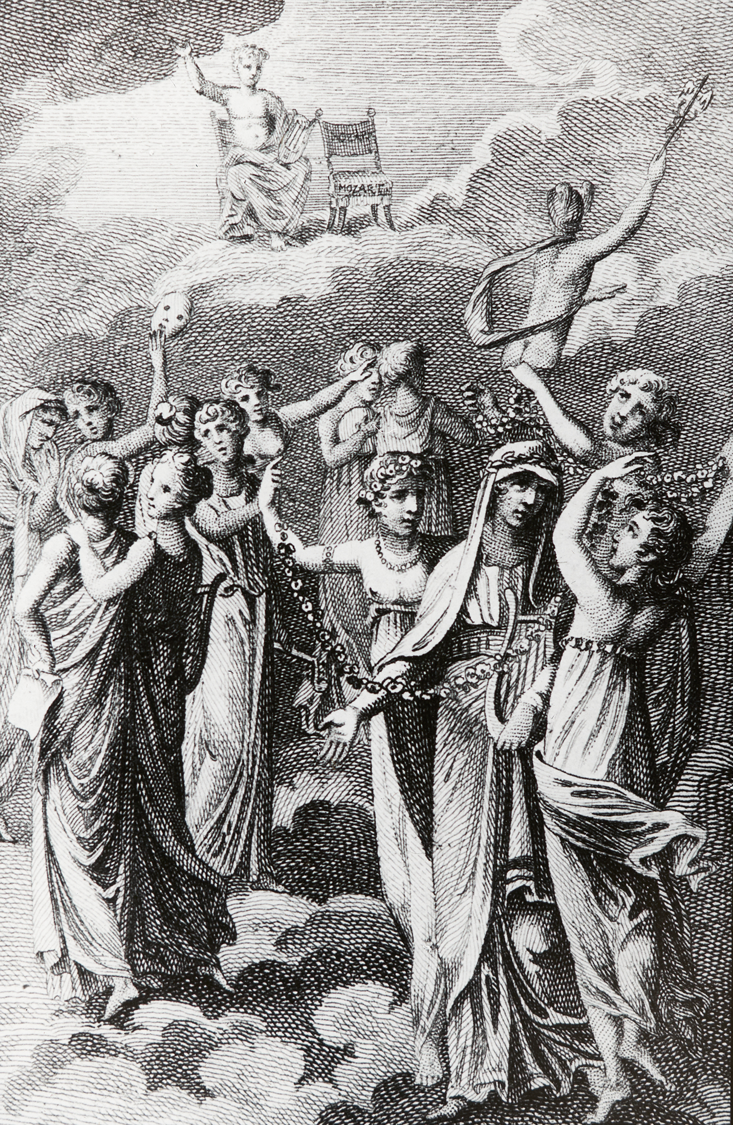 Eine Zeichnung, die den Himmel zeigt. Im Hintergrund erkennt man am freien Sessel die Aufschrift "Mozart". Hier soll vermutlich der Tod des Komponisten und seine Empfägnis im Himmel dargestellt werden.