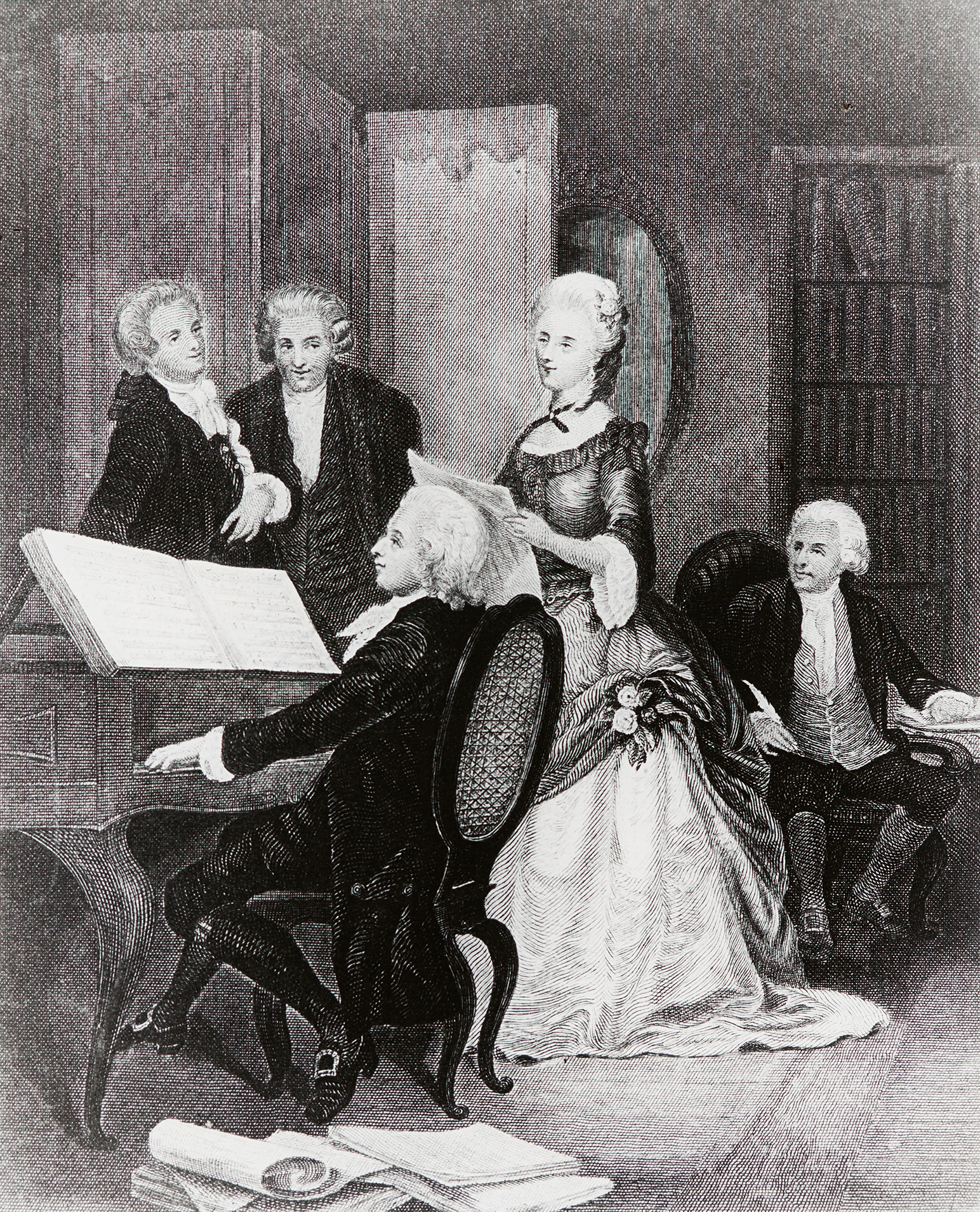 Mozart beim Klavierspiel, begleitet von einer Sängerin. Im Hintergrund sehen und hören drei Männer dabei zu.