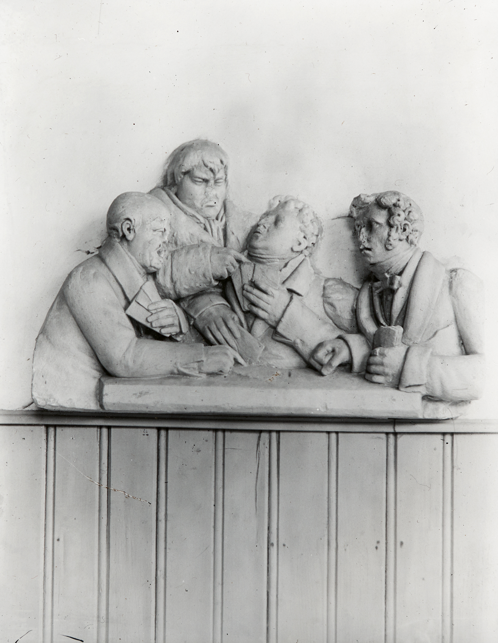 Die Skulptur zeigt vier Männer, die um einen Tisch versammelt sind und beim Kartenspiel diskutieren.