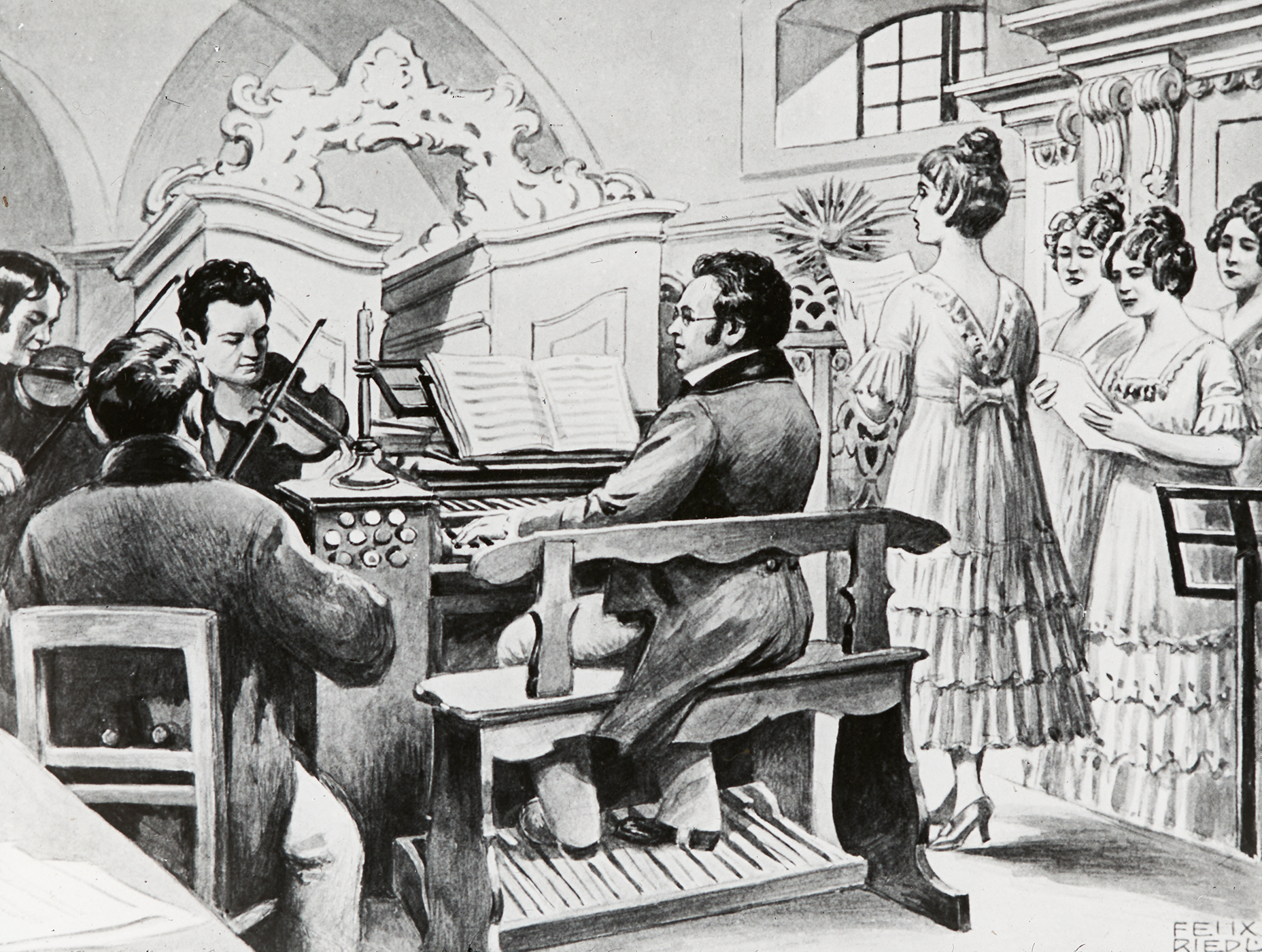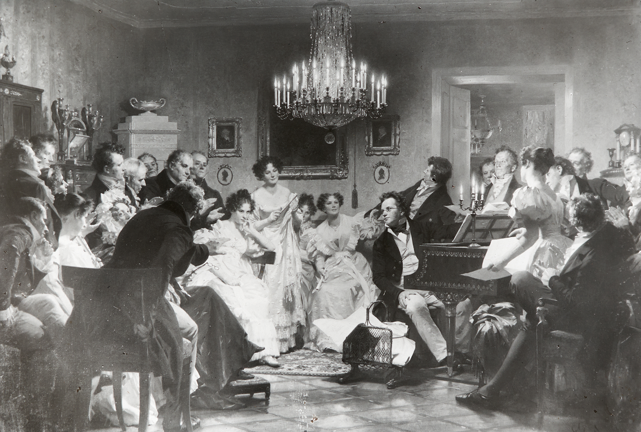 Franz Schubert spielt Piano für seine Bekannten. Rund um ihn sind in diesem prunkvollen Raum mit Kronleuchter und Gemälde an den Wänden seine Freunde und Bekannte versammelt.
