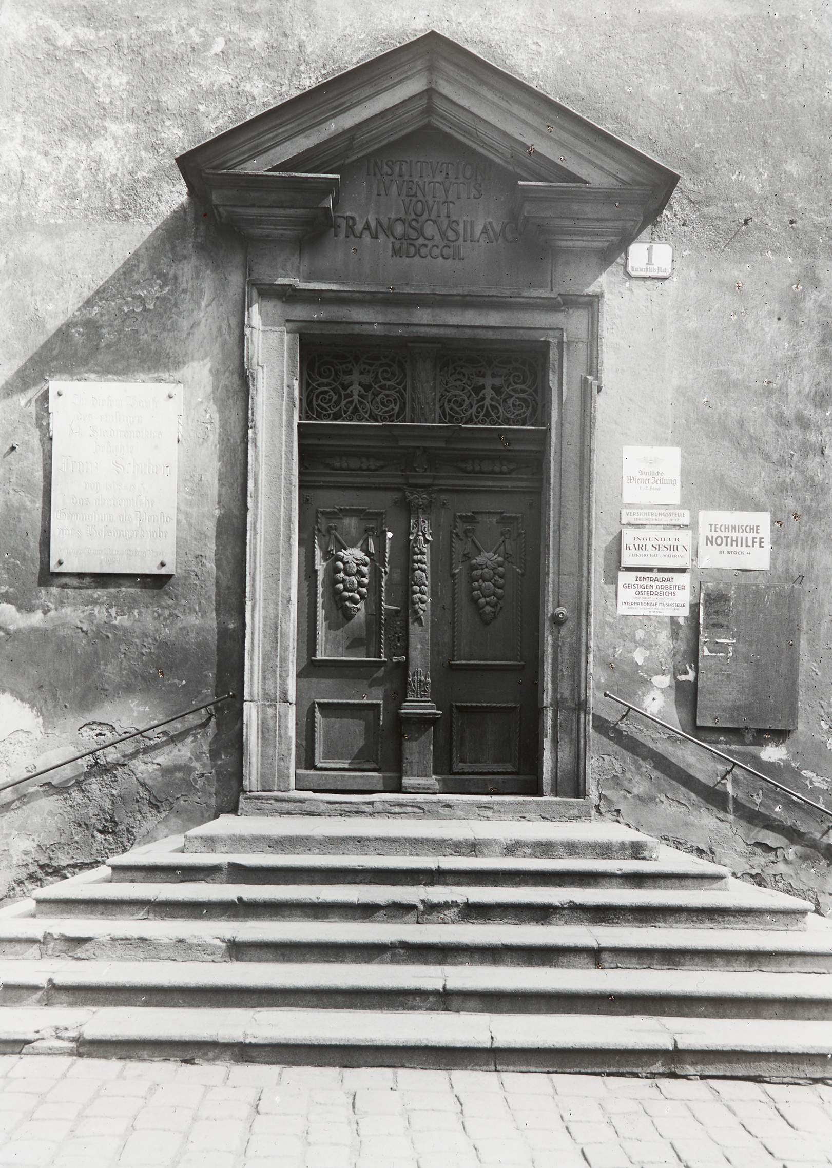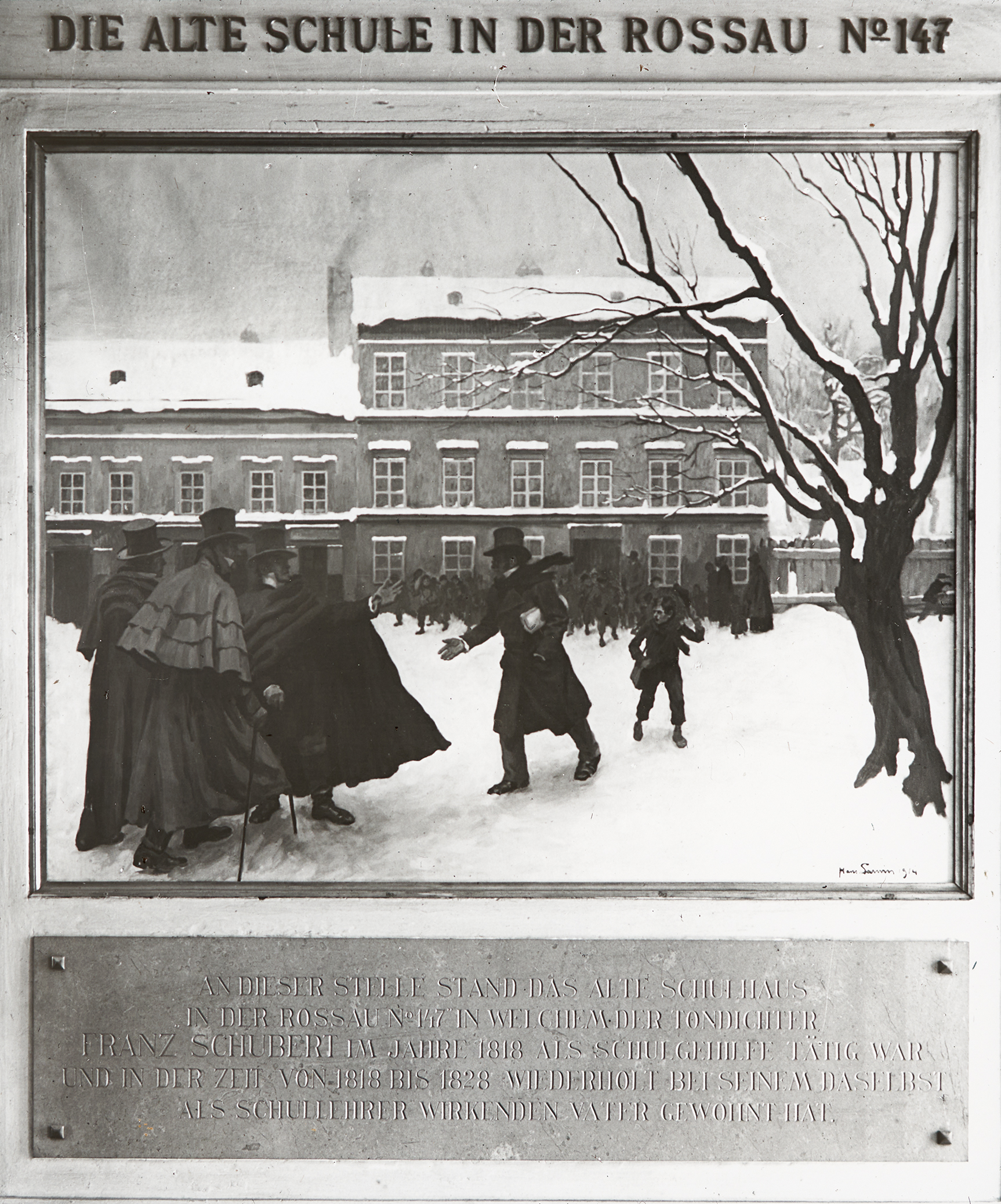 "An dieser Stelle stand das alte Schulhaus in der Rossau No.147, in welchem der Tondichter Franz Schubert im Jahre 1818 als Schulgehilfe tätig war und in der Zeit von 1818 bis 1828 wiederholt bei seinem daselbst als Schullehrer wirkenden Vater gewohnt hat."