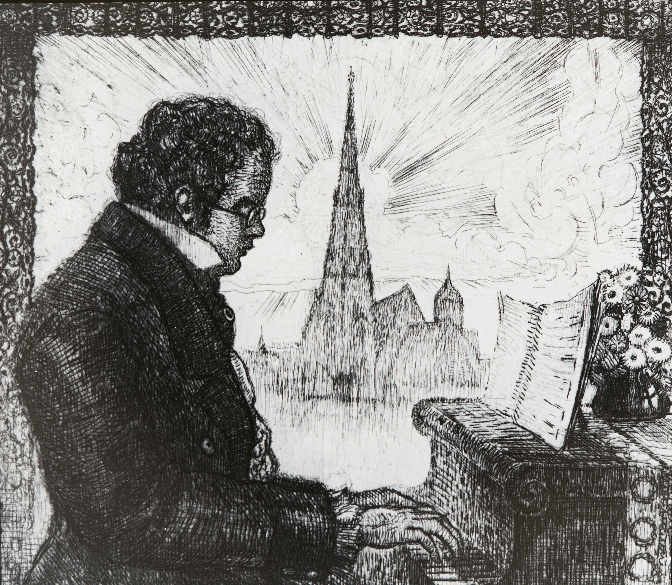 Franz Schubert beim Klavierspiel, im Hintergrund ist der Stephansdom zu sehen.