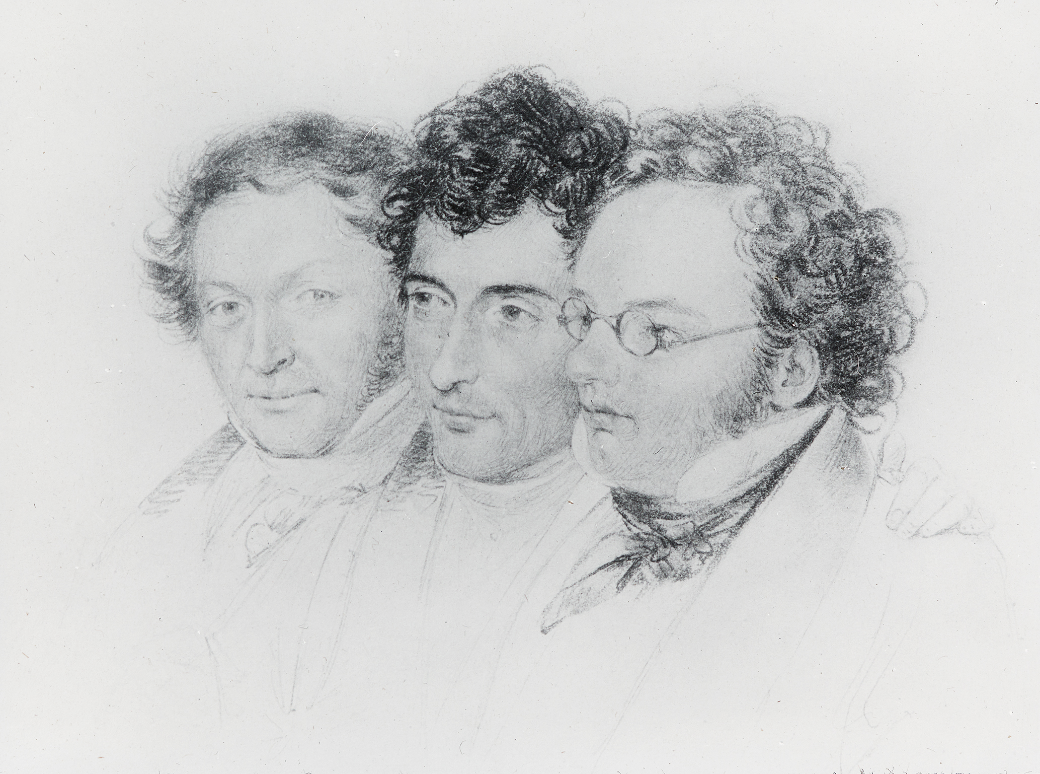 Johann Baptist Jenger, Anselm Hüttenbrenner und Franz Schubert (von links nach rechts). Jenger und Hüttenbrenner waren zwei der wichtigsten Begleiter von Schubert. Auch die beiden waren als Komponisten tätig.
