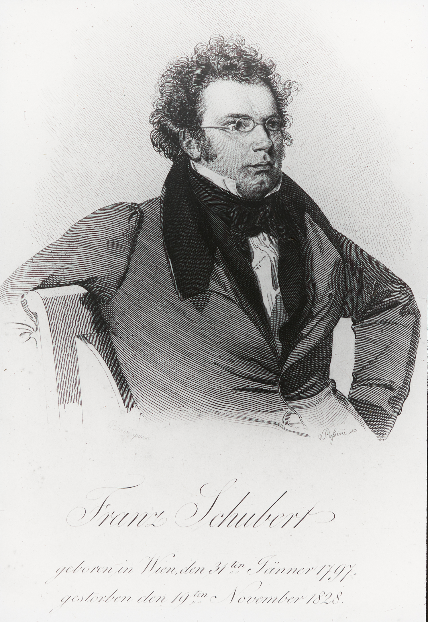 "Franz Schubert, geboren in Wien, den 31ten Jänner 1797, gestorben den 19ten November 1828." Ein Portrait des Komponisten Franz Schubert.
